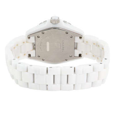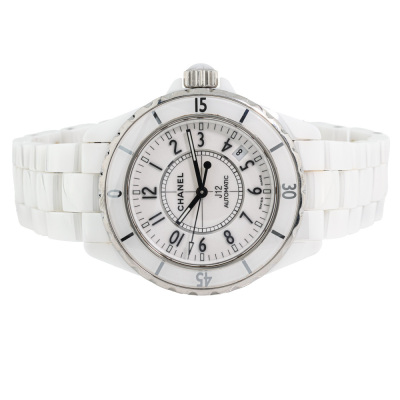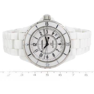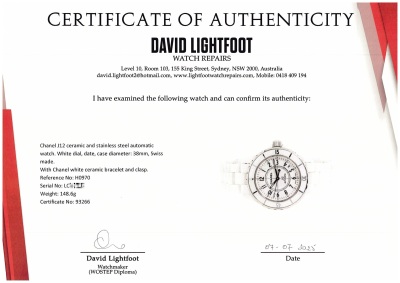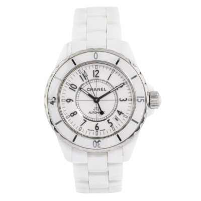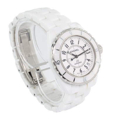 Chanel J12 ceramic and stainless steel automatic mens watch. White dial, date, case diameter: 38mm, wrist size: 19.5cm, Swiss made. Ref# H0970. With Chanel white ceramic bracelet and clasp. With Certificate of Authenticity, undated Chanel Certificate of Authenticity and International Guarantee card and Chanel box. 3 month FSA warranty (Pre-owned)
