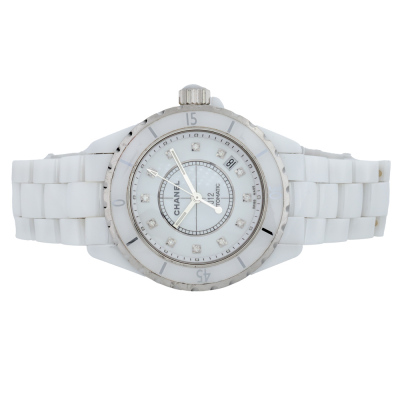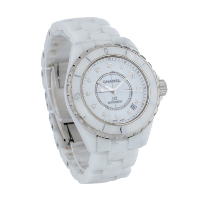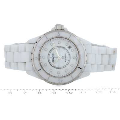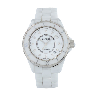 Chanel J12 ceramic and stainless steel automatic watch. White dial, Diamond indicators, date, case diameter: 38mm, wrist size: 18.5cm, Swiss made. Ref# H1629. With Chanel white ceramic bracelet and clasp. With Certificate of Authenticity, Undated Chanel International Guarantee booklet and Chanel box. 3 month FSA warranty (Pre-owned)