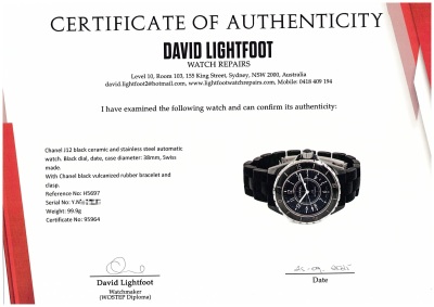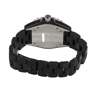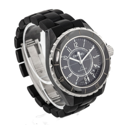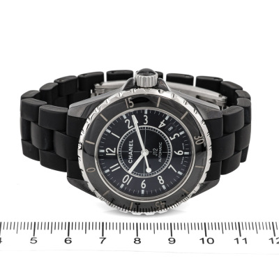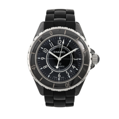 Chanel J12 black ceramic and stainless steel automatic watch. Black dial, date, case diameter: 38mm, wrist size: 16cm. Swiss made. Ref #H5697. With Chanel black vulcanized rubber bracelet and clasp. With Certificate of Authenticity. 3 month FSA warranty. Weight: 99.9g (Pre-owned)