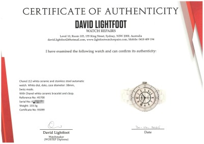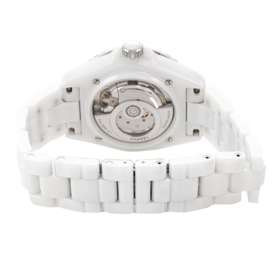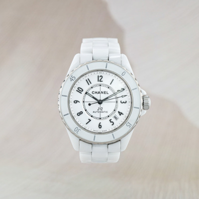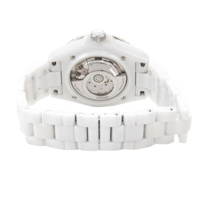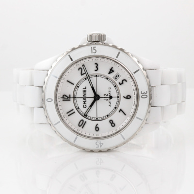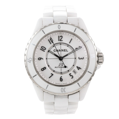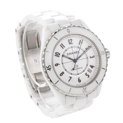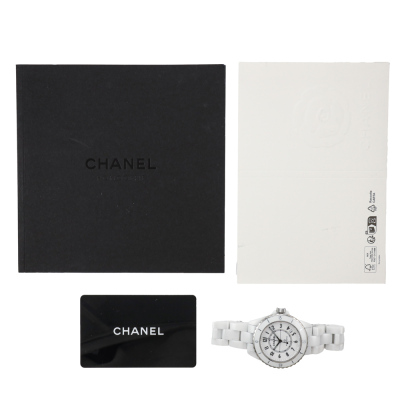 Chanel J12 white ceramic and stainless steel automatic watch. White dial, date, case diameter: 38mm, wrist size: 17cm, Swiss made. Ref #H5700. With Chanel white ceramic bracelet and clasp. With Certificate of Authenticity, Chanel International Warranty card dated 27/09/2021, Chanel invoice for a new bezel dated 18/12/25 and Chanel box & case with Chanel gift bag. Balance of 5 year Chanel manufacturer warranty applies. Weight: 133.5g (Pre-owned)