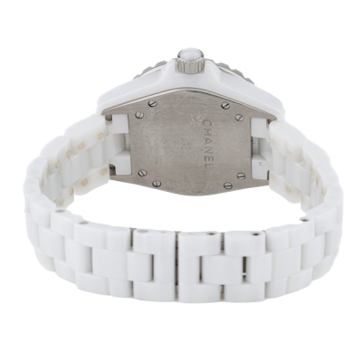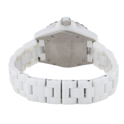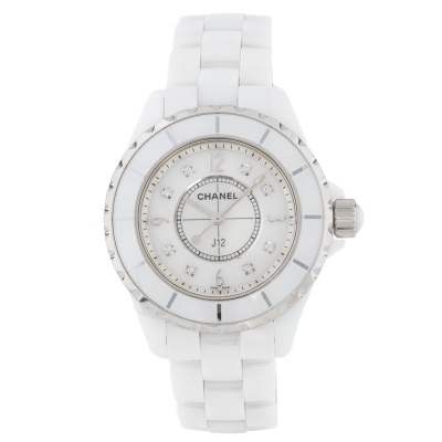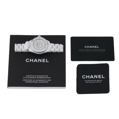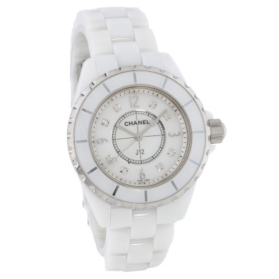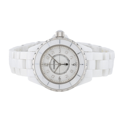 Chanel J12 white ceramic and stainless steel quartz watch. Mother of Pearl dial, Diamond indicators, case diameter: 33mm, wrist size: 17.5cm, Swiss made. Ref# H2422. With Chanel white ceramic bracelet and clasp. With Certificate of Authenticity, Chanel International Warranty card dated 13/08/2011 and Chanel box. 3 month FSA warranty. Weight: 103.0g