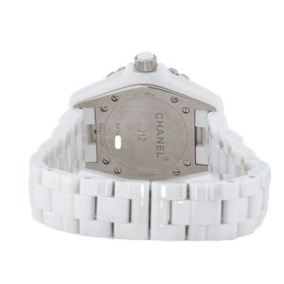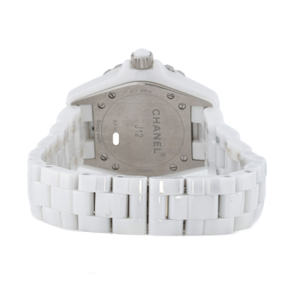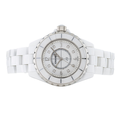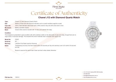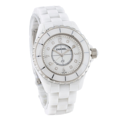 Chanel J12 white ceramic and stainless steel quartz watch. Mother of Pearl dial, Diamond indicators, case diameter: 33mm, wrist size: 17.5cm, Swiss made. Ref# H2422. With Chanel white ceramic bracelet and clasp. With Certificate of Authenticity, Chanel guarantee card dated 23/06/2018 and Chanel box. 3 month FSA warranty