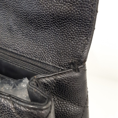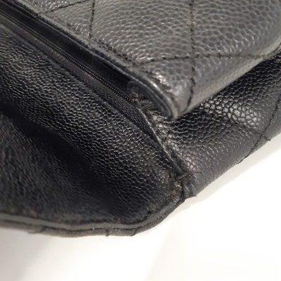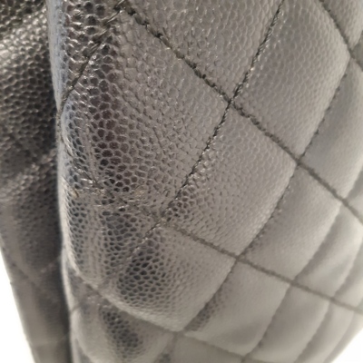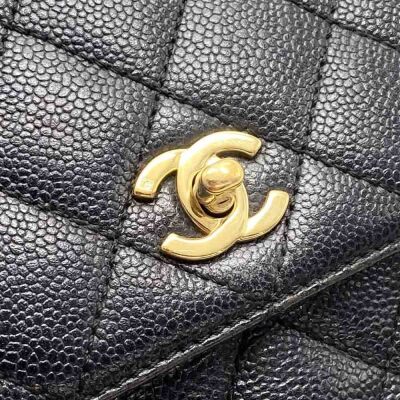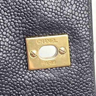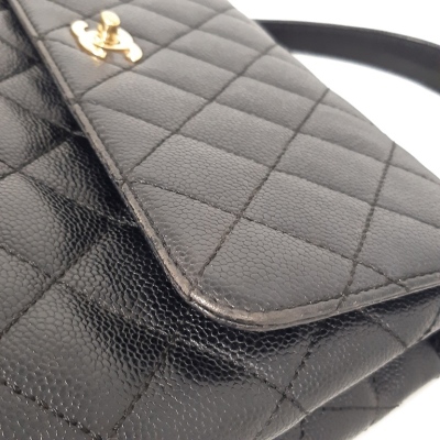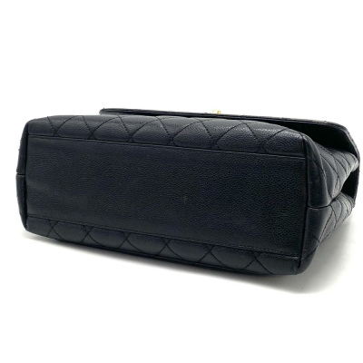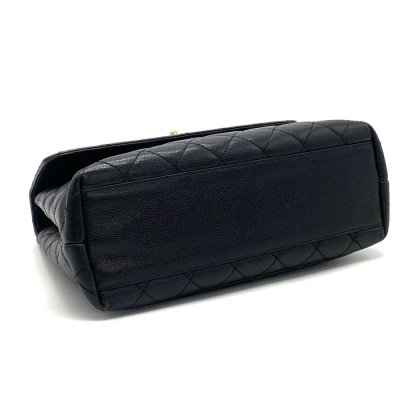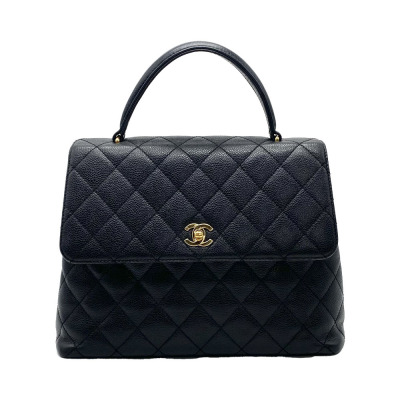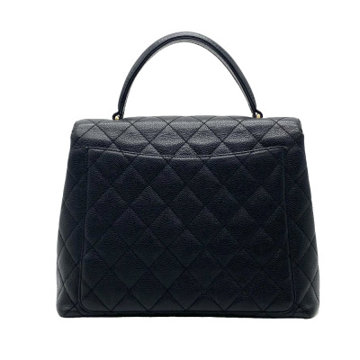 Chanel Kelly top handle bag in black diamond-quilted caviar leather (7xxxxxx, circa: 2002-2003). Featuring gold-toned hardware, single top leather handle, and rear exterior patch pocket. The classic CC turn-lock closure opens to a black smooth leather interior with patch pocket and a zip pocket. Approximate dimensions: 29cm(Base-L) x 24cm(H) x 12cm(D), handle drop 8cm. Accompanied by a Chanel authentication card. With Entrupy Certificate of Authenticity. (Pre-owned).