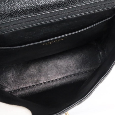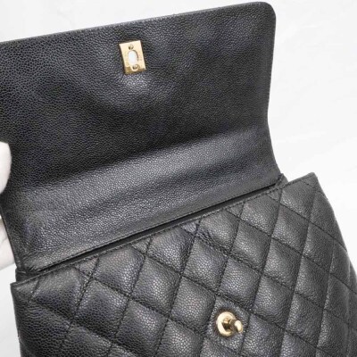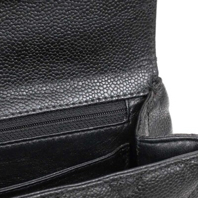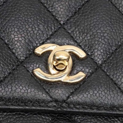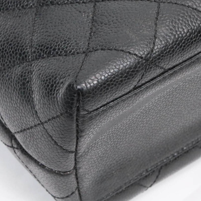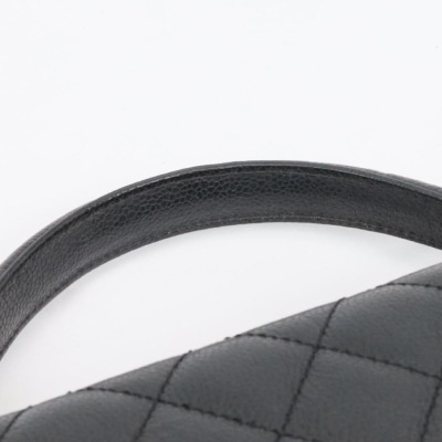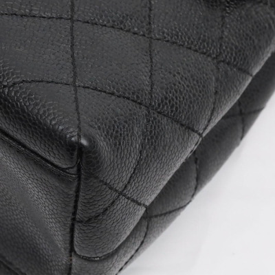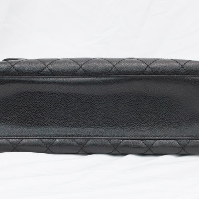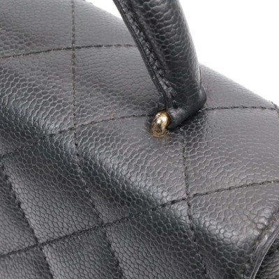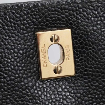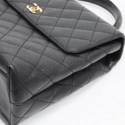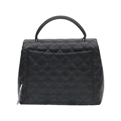 Chanel Kelly top handle bag in black diamond-quilted caviar leather (8xxxxxx, circa: 2003 - 2004). Featuring gold-toned hardware, single top leather handle, and rear exterior patch pocket. The classic CC turn-lock closure on flap opens to a black smooth leather interior with patch pocket and a zip pocket. Approximate dimensions: 29cm(Base-L) x 24cm(H) x 12cm(D), handle drop 8cm. Accompanied by a Chanel authentication card. With Entrupy Certificate of Authenticity.