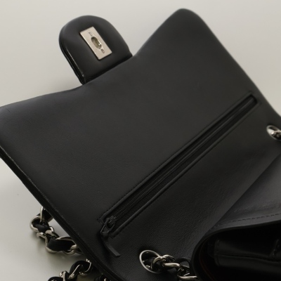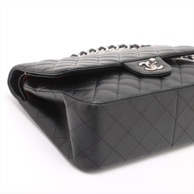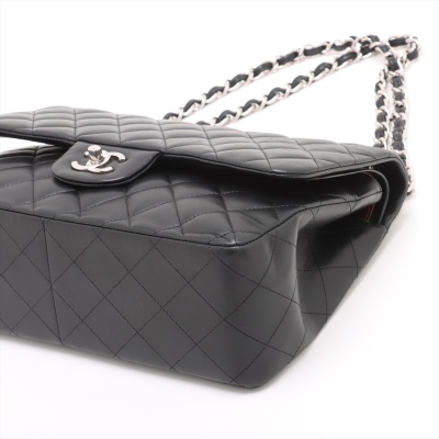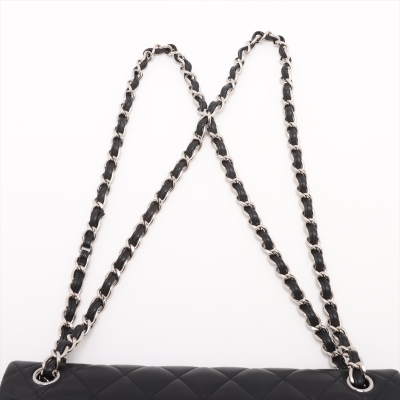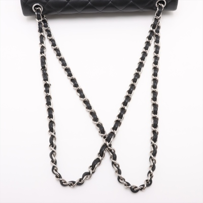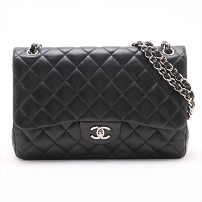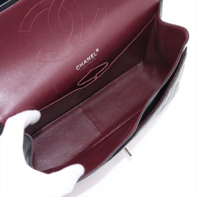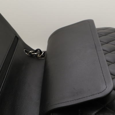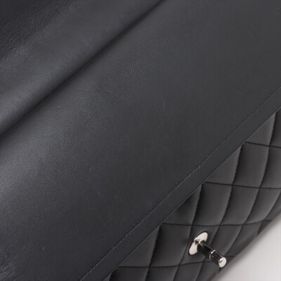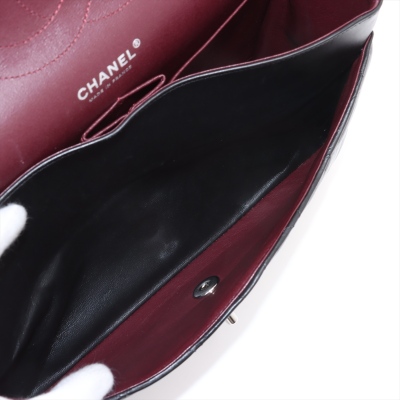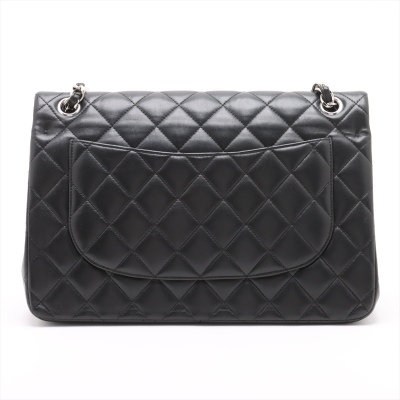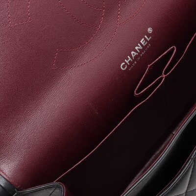 Chanel large classic double flap bag in black diamond-quilted lambskin (#27xxxxxx, circa: 2019). Featuring silver-toned hardware, an exterior rear pocket, and a semi-full front flap with a Chanel CC turn lock. This reveals the inner flap to open front flat pocket and burgundy leather lining interior with patched pockets. Approximate dimensions: 30cm(W) x 19.5cm(H) x 9cm(D), with a 33cm double chain drop. Accompanied by a Chanel authenticity card. With Entrupy Certificate of Authenticity.