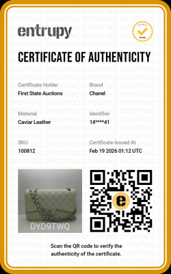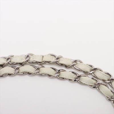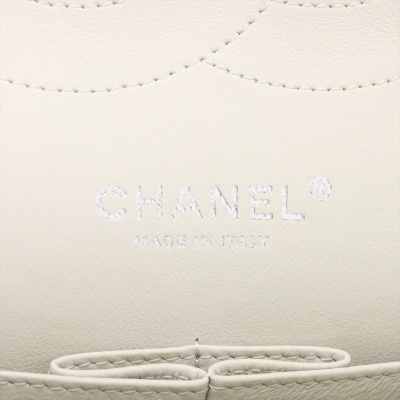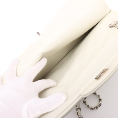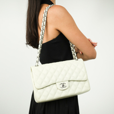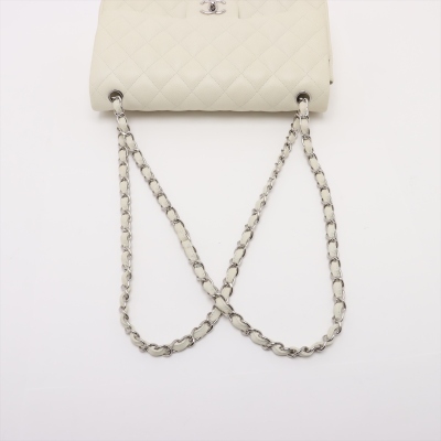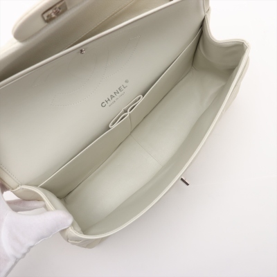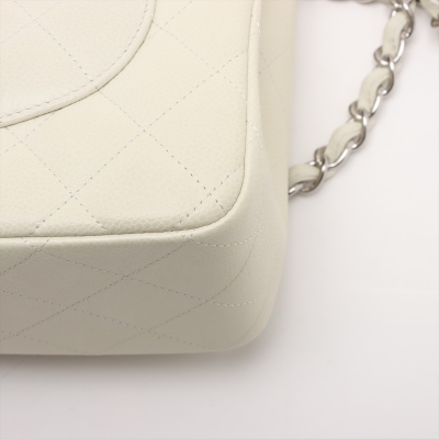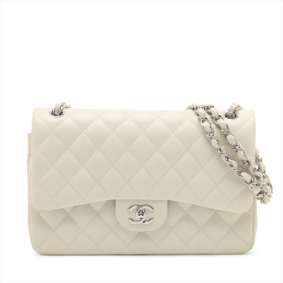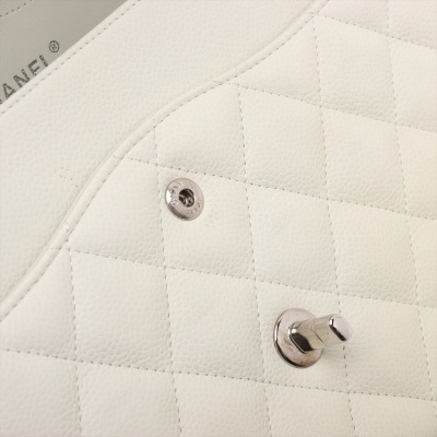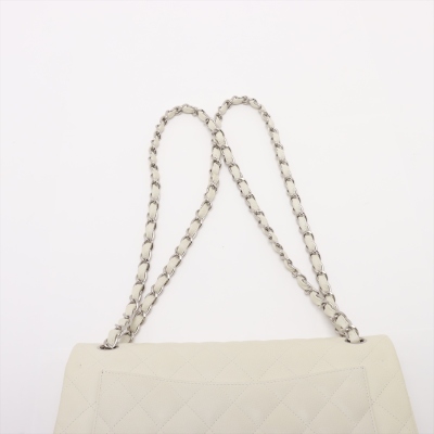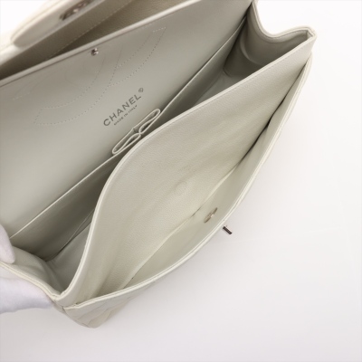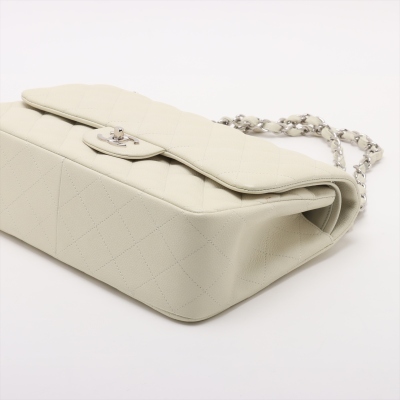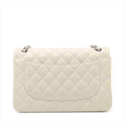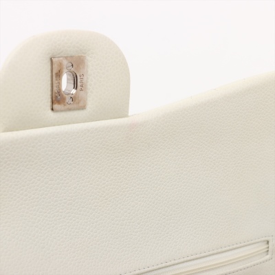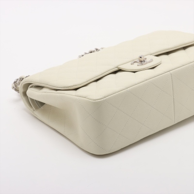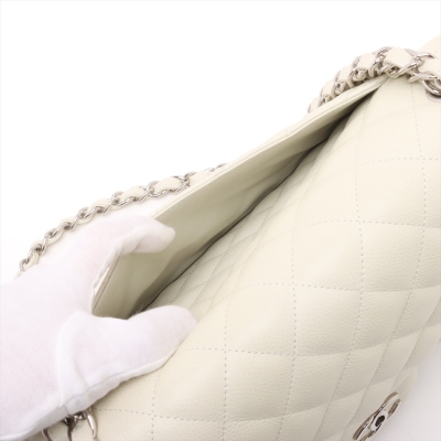 Chanel large double Flap bag in ivory caviar skin leather (#14XXXXXX, circa: 2011). Featuring silver-toned hardware, exterior rear pocket, and a semi-full front flap with a Chanel CC turn-lock. This opens to reveal a matching leather interior with patch and zippered pockets. Approximate dimensions: 30cm(W) x 19cm(H) x 9cm(D), with a 33cm doubled chain drop. With Entrupy Certificate of Authenticity.
