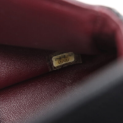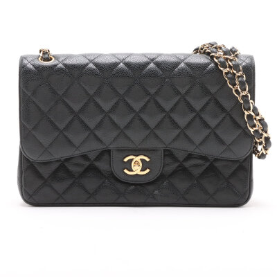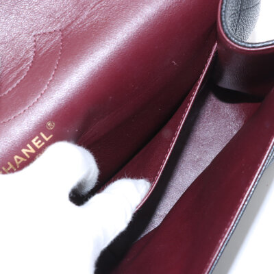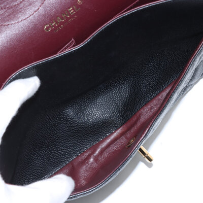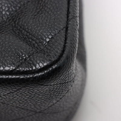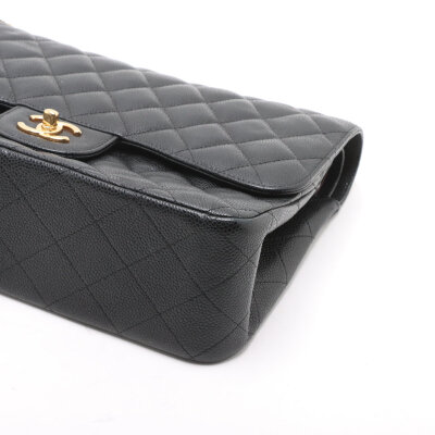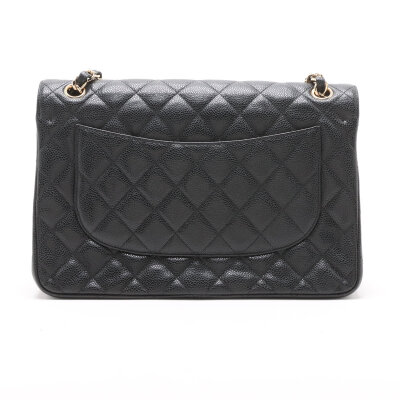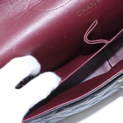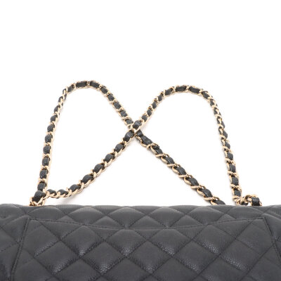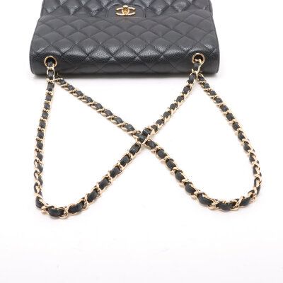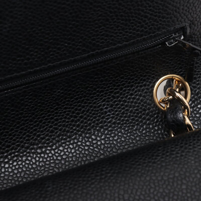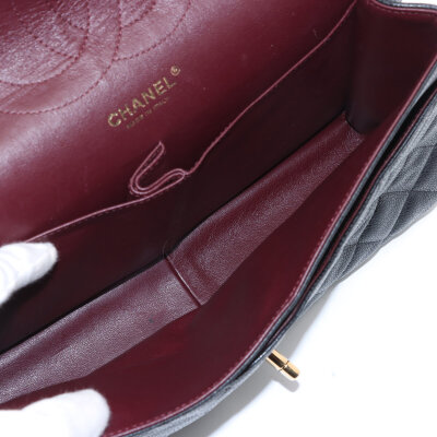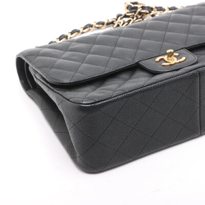 Chanel large double flap in black diamond quilted caviar skin leather (#16XXXXXX,circa: 2012). Featuring gold-toned hardware, an exterior rear pocket, leather-chain link sliding strap, and a semi-full front flap with a Chanel CC turn lock. This opens to a burgundy leather interior with a flap pocket, and a main compartment with patch pockets, with a zipper pocket under flap. Approximate dimensions: 30cm(W) x 19.5cm(H) x 9cm(D), with a 32cm double chain strap drop. With Entrupy Certificate of Authenticity.