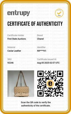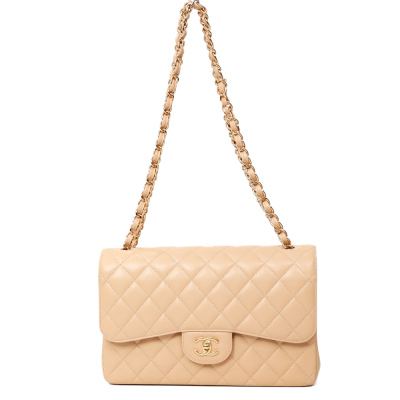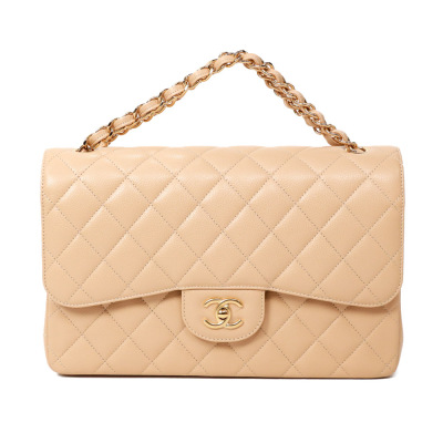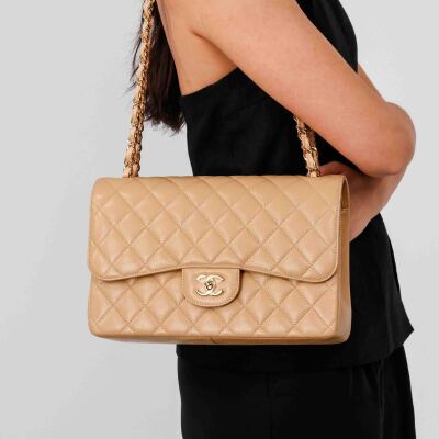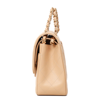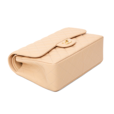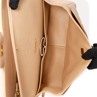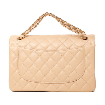 Chanel large double flap bag in beige diamond-quilted caviar leather (#N9xxxxxx). Featuring gold-toned hardware, and exterior rear pocket. The CC turn-lock closure opens to an inner flap and beige leather interior with patch and zipper pockets. Approximate dimensions: 30cm(L) x 19.5cm(H) x 9cm(D), double chain shoulder strap drop 34cm. Accompanied by Chanel stamped card, info booklet, dustbag and box. With Entrupy Certificate of Authenticity. (As new)*