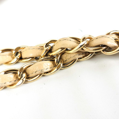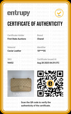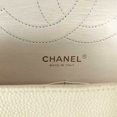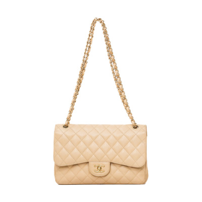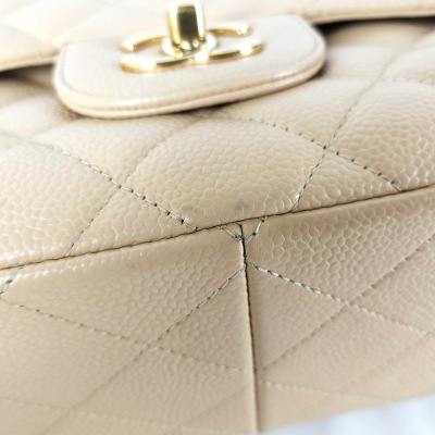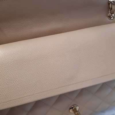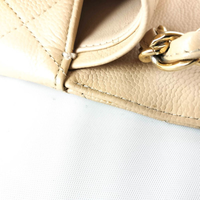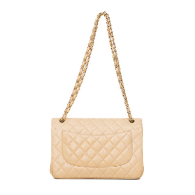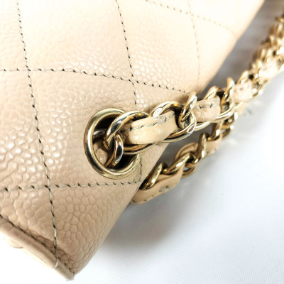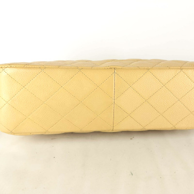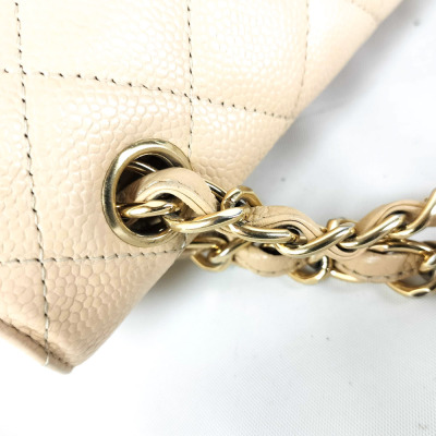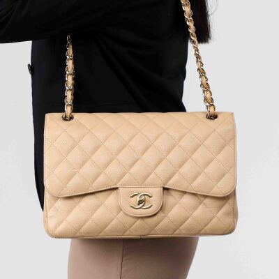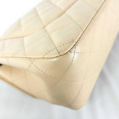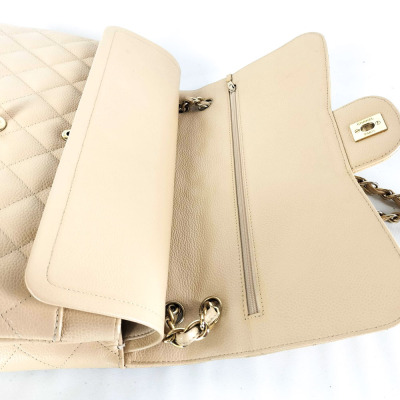 Chanel large double flap bag in beige diamond-quilted caviar leather (#18xxxxxx). Featuring gold-toned hardware, exterior rear pocket, a semi-full front flap with a Chanel CC turn-lock. This opens to reveal an inner flap and beige leather interior with patch and zipper pockets. Approximate dimensions: 30cm(L) x 19.5cm(H) x 9cm(D), double chain shoulder strap drop 34cm. With Entrupy Certificate of Authenticity. (Pre-owned)