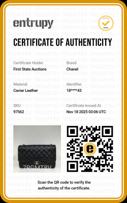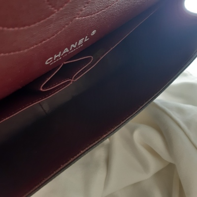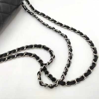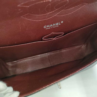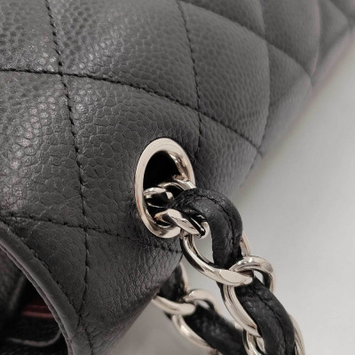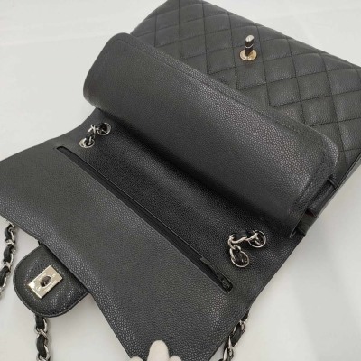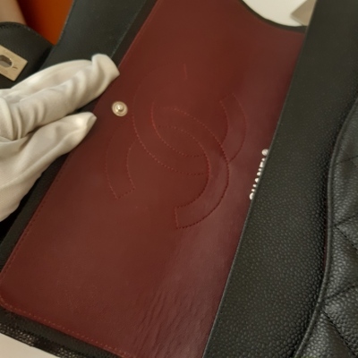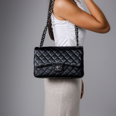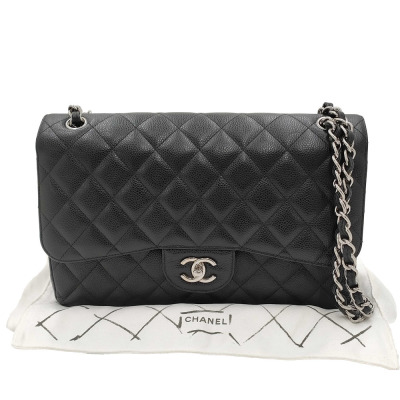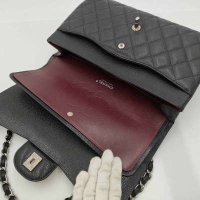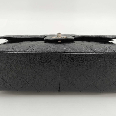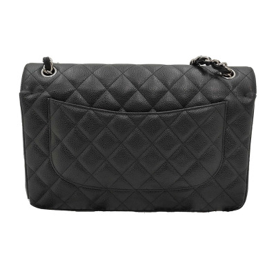 Chanel large double flap bag in black diamond-quilted Caviar skin (#18xxxxxx). Featuring silver-tone hardware, exterior rear pocket, a semi-full front flap with a Chanel CC turn-lock. This opens to reveal an inner flap and burgundy leather interior with patch and zipper pockets. Approximate dimensions: 30cm(L) x 19.5cm(H) x 9cm(D), double chain shoulder strap drop 34cm. Accompanied by Chanel dustbag. With Entrupy Certificate of Authenticity. (Pre-owned)