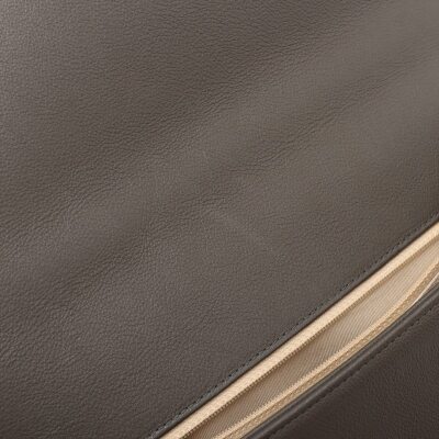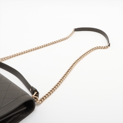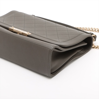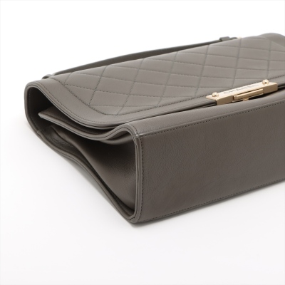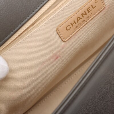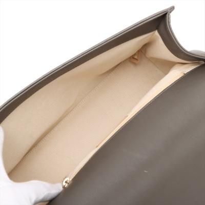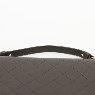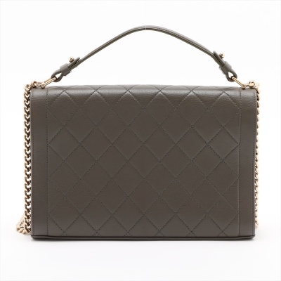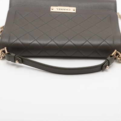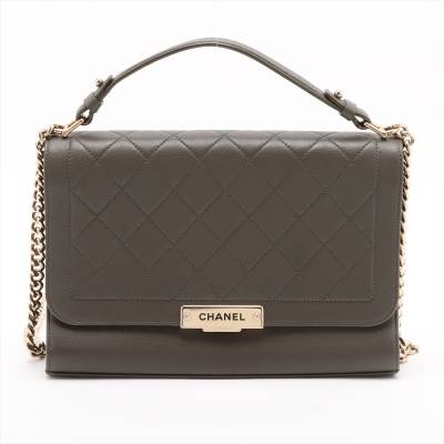 Chanel large Label Click flap bag in Khaki diamond-quilted calfskin leather (#23xxxxxx: 2016-2017). Featuring light gold-toned hardware, single leather handle, and chain shoulder strap with a leather shoulder pad. The push-lock closure with logo plate opens to a beige textile interior with a zipper pocket. Approximate dimensions: 29cm(L) x 19.5cm(H) x 8.5cm(D), handle drop 7.5cm, strap drop 51cm. With Entrupy Certificate of Authenticity. (Pre-owned)