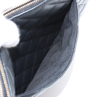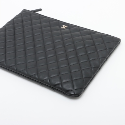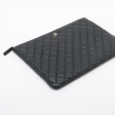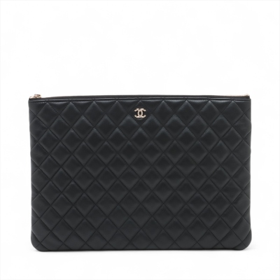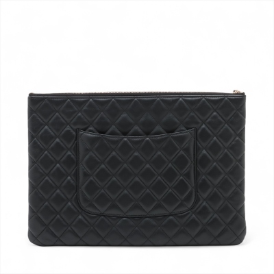 Chanel large O Case clutch in black diamond-quilted lambskin leather (#22xxxxxx). Featuring light gold-toned hardware, and patched pocket at back. The top zipper opens to a black textile interior with a zipper pocket. Approximate dimensions: 34cm(L) x 23cm(H). Accompanied by Chanel dustbag and box. With Entrupy Certificate of Authenticity. (Pre-owned)