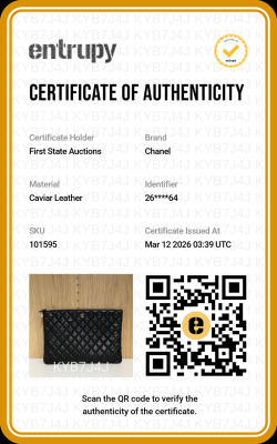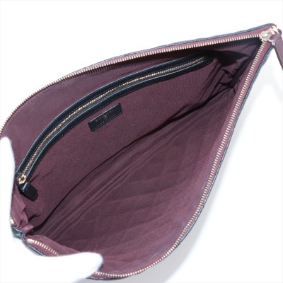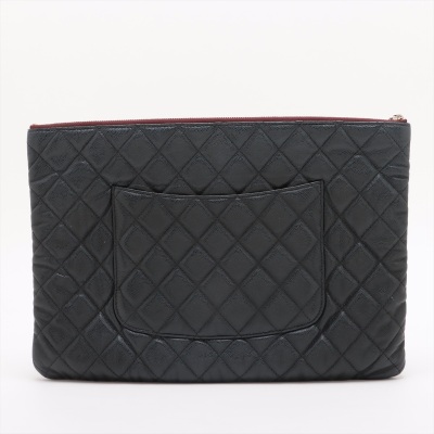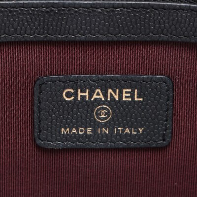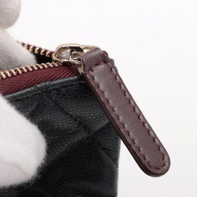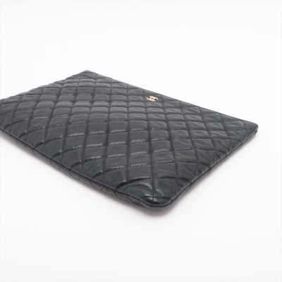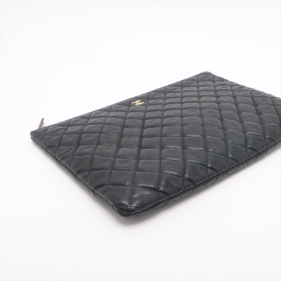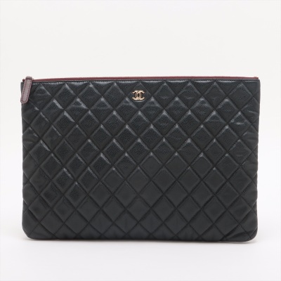 Chanel large O Case clutch in black diamond-quilted caviar skin leather (#26XXXXXX, circa: mid2019). Featuring light gold-toned hardware and a rear patch pocket. The top zipper opens to a burgundy textile interior with a zippered pocket. Approximate dimensions: 34cm(W) x 23cm(H). Accompanied by a Chanel authenticity card and care cards. With Entrupy Certificate of Authenticity.