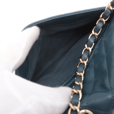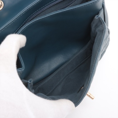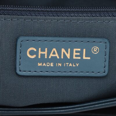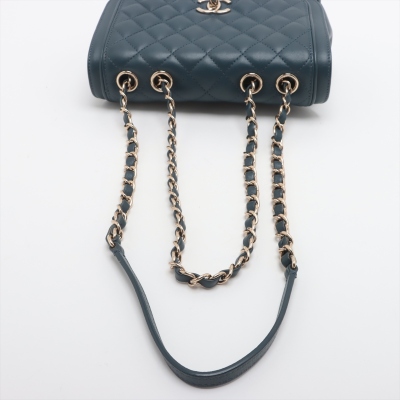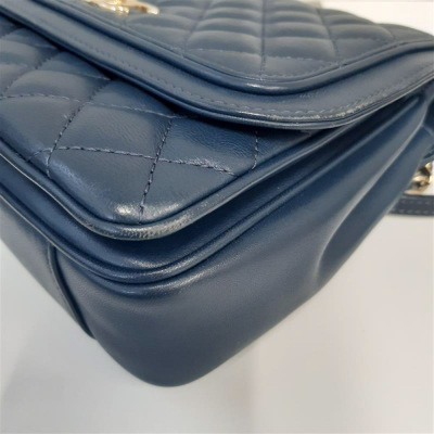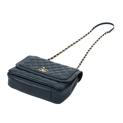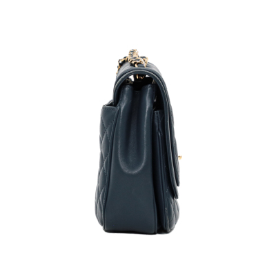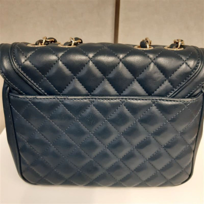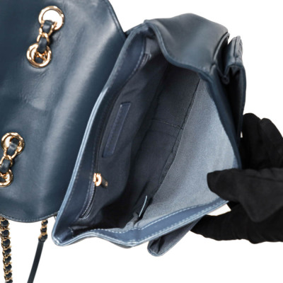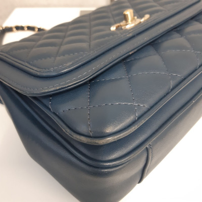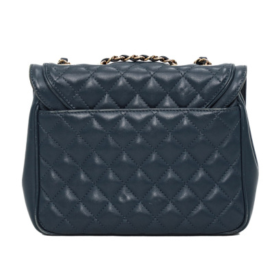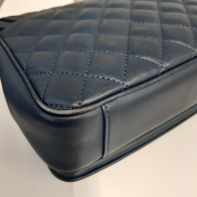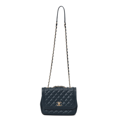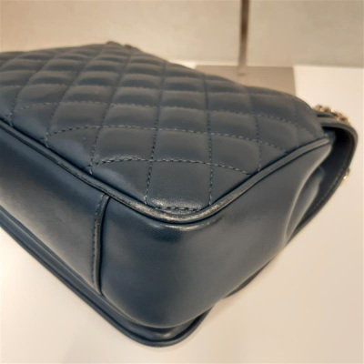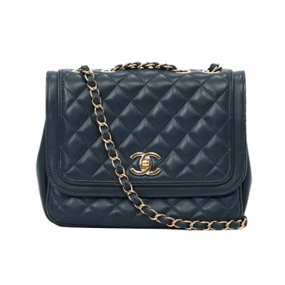 Chanel Lovely Day square flap bag in navy blue, diamond quilted lambskin leather (#26xxxxxx, late2018-2019). Featuring light gold-tone hardware, a rear patched pocket, and interlocking CC turn lock on front flap. This opens to an inner front flat pocket and a spacious blue fabric interior with a zipper pocket. Approx. dimensions: 21.5cm(W) x 17cm(H) x 6cm(D), 52cm chain shoulder strap drop. Accompanied by receipt, card, dustbag & box. With Entrupy Certificate of Authenticity. (Pre-owned)