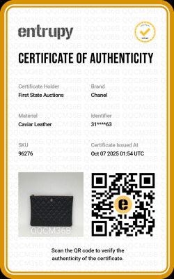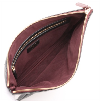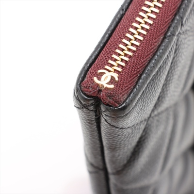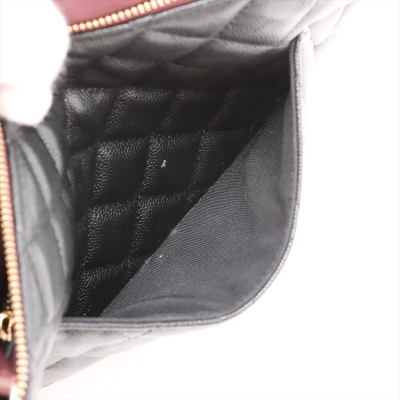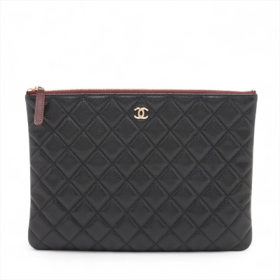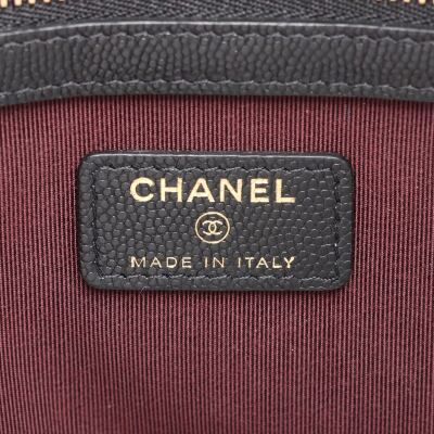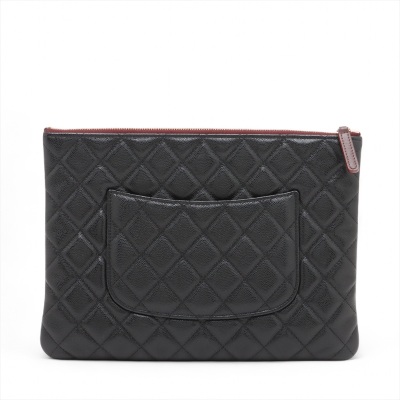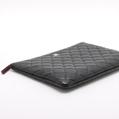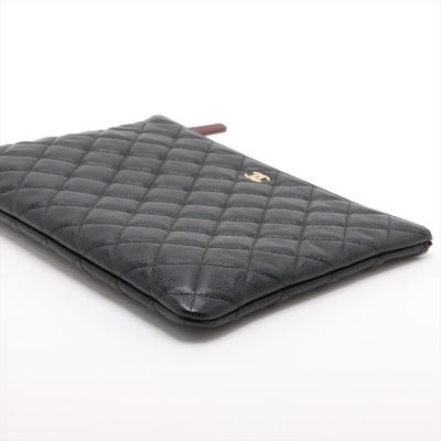 Chanel O Case clutch in black diamond-quilted caviar leather (#31xxxxxx). Featuring light gold-toned hardware and an exterior back patch pocket. The zipper top opens to a burgundy textile interior with a zipper pocket. Approximate dimensions: 27cm(L) x 19.5cm(H). Accompanied by Chanel certificate card, dustbag, and box. With Entrupy Certificate of Authenticity. (Pre-owned)