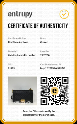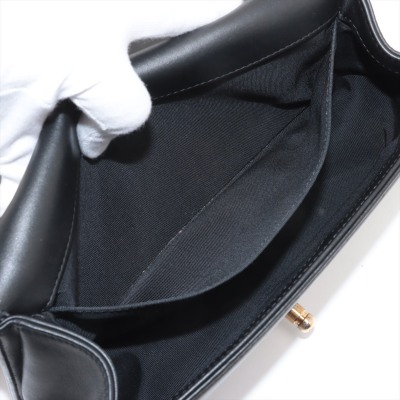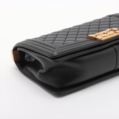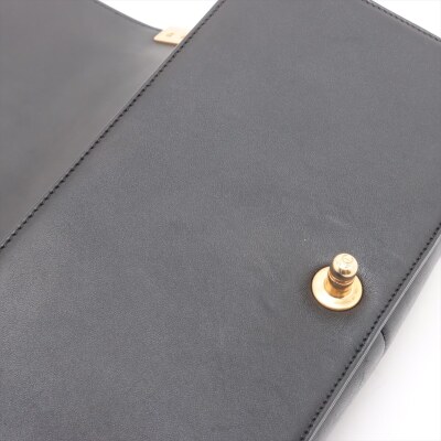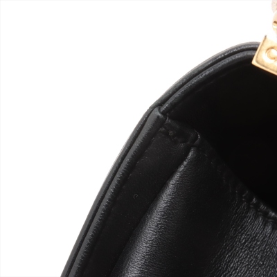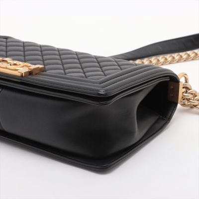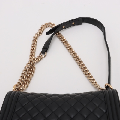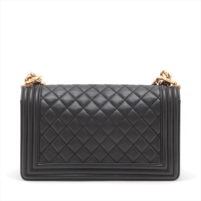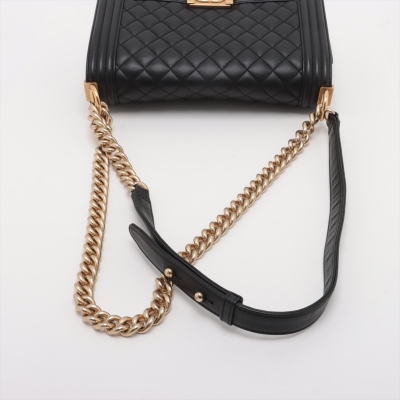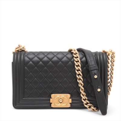 Chanel medium Boy flap bag in diamond-quilted black lambskin leather with linear-quilted border (#23xxxxxx). Featuring antique gold-toned hardware, front flap with Chanel boy logo press-lock closure. This opens to a black textile interior with a patch pocket. Approximate dimensions: 25cm(L) x 15cm(H) x 7cm(D), chain link with leather pad shoulder strap drop 53cm. With Entrupy Certificate of Authenticity. (Pre-owned)