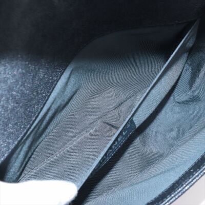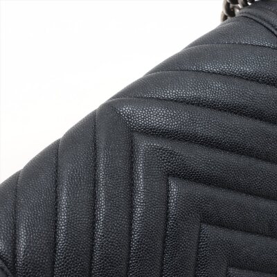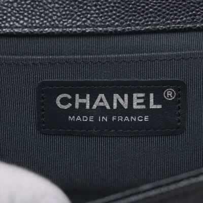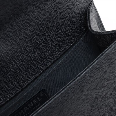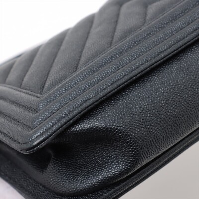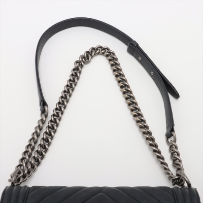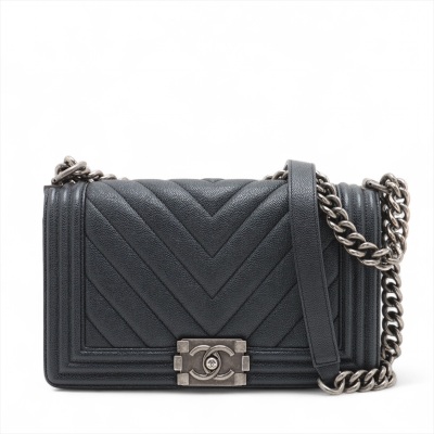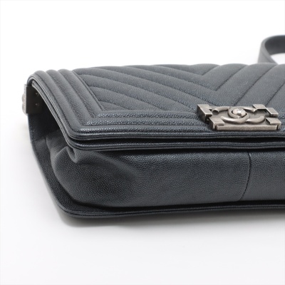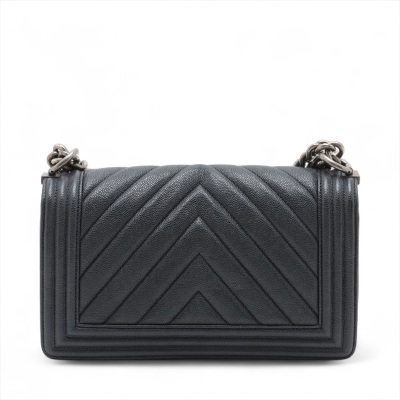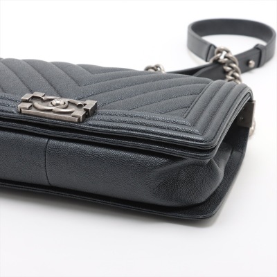Chanel medium Boy flap bag in chevron quilted dark navy blue caviar leather with linear quilted border (#26xxxxxx). Featuring antique silver-toned hardware, front flap with Chanel boy logo press-lock closure. This opens to a colour matching textile interior with a patch pocket. Approximate dimensions: 25cm(L) x 15cm(H) x 7cm(D), chain strap drop 52cm. Accompanied by Chanel dustbag. With Entrupy Certificate of Authenticity. (Pre-owned)