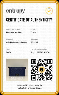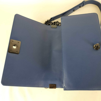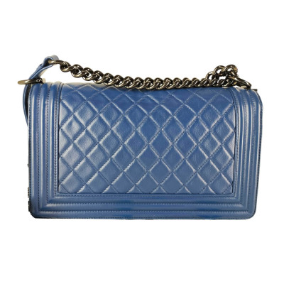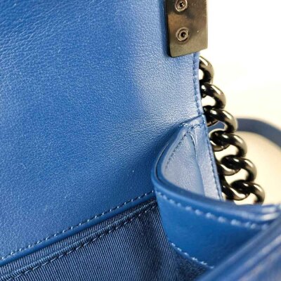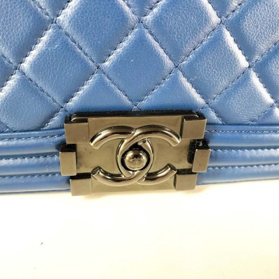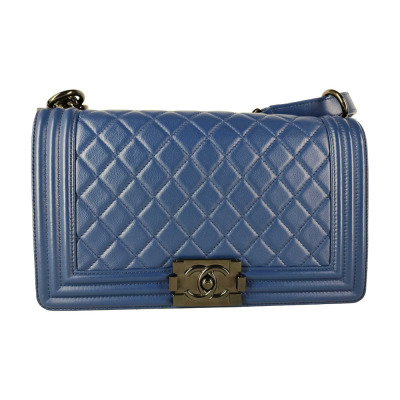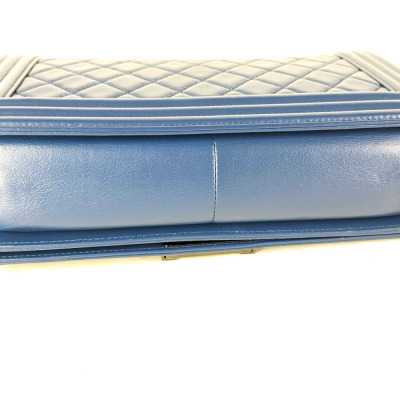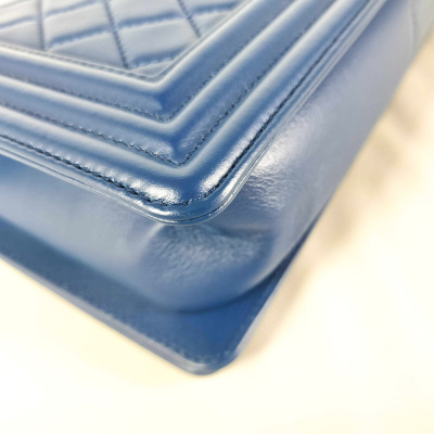 Chanel medium Boy flap bag in diamond-quilted blue lambskin leather with linear-quilted border (#25xxxxxx). Featuring shiny black-toned hardware, front flap with Chanel boy logo press-lock closure. This opens to a blue textile interior with a patch pocket. Approximate dimensions: 25cm(L) x 15cm(H) x 7cm(D), chain link with leather pad shoulder strap drop 53cm. With Entrupy Certificate of Authenticity. (Pre-owned)