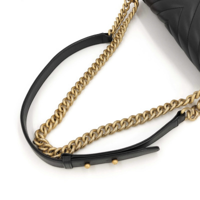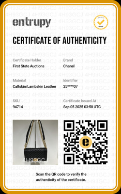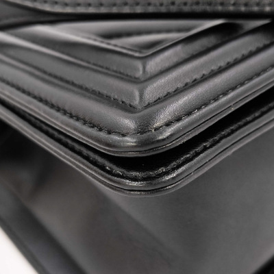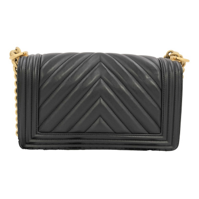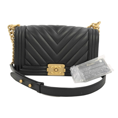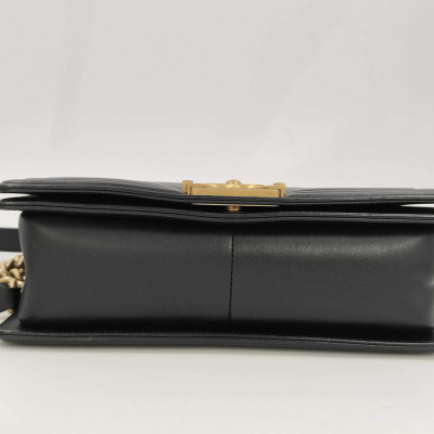 Chanel medium Boy flap bag in chevron-quilted black lambskin leather with linear-quilted border (#25xxxxxx). Featuring antique gold-toned hardware, front flap with Chanel boy logo press-lock closure. This opens to a black textile interior with a patch pocket. Approximate dimensions: 25cm(L) x 15cm(H) x 7cm(D), chain link with leather pad shoulder strap drop 53cm. Accompanied by Chanel certificate card. With Entrupy Certificate of Authenticity. (Pre-owned)
