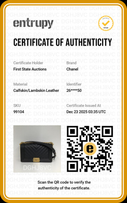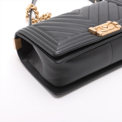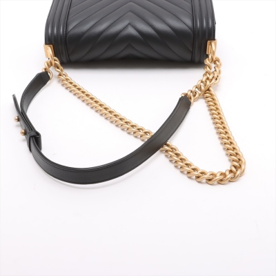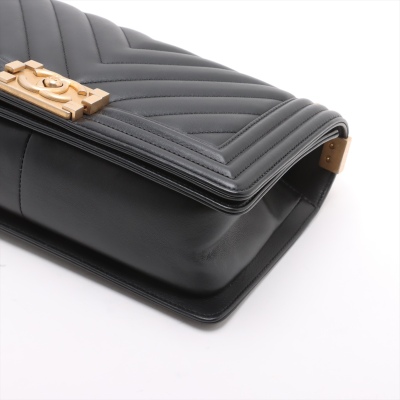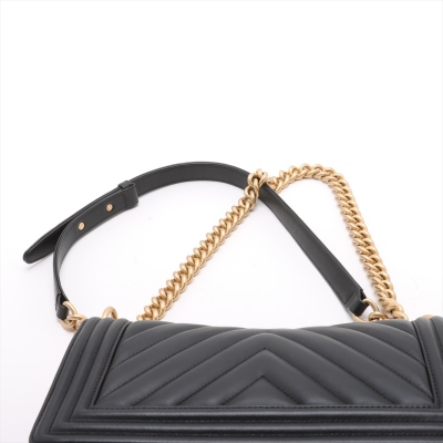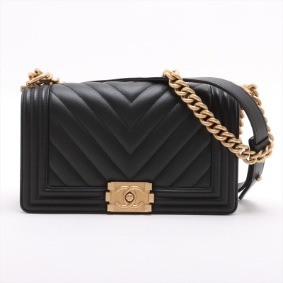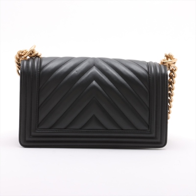Chanel medium Boy flap bag in chevron-quilted black lambskin with a linear-quilted border (#26xxxxxx, circa: 2018-2019). Featuring aged gold-toned hardware, frontal flap with Chanel boy logo press-lock closure. It opens to a black textile-lined interior with a patch pocket. Approximate dimensions: 25cm(L) x 15cm(H) x 7.5cm(D), 52cm shoulder sliding chain link strap drop. Accompanied by a Chanel certificate card. With Entrupy Certificate of Authenticity. (Pre-owned)