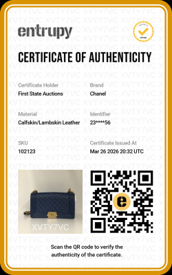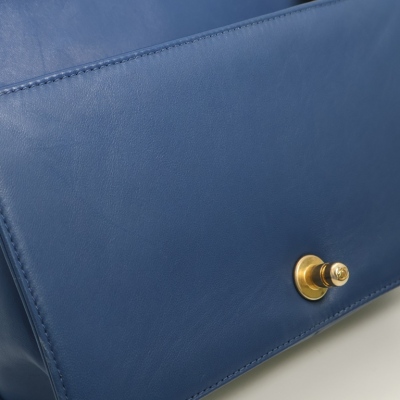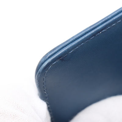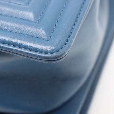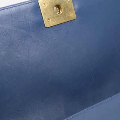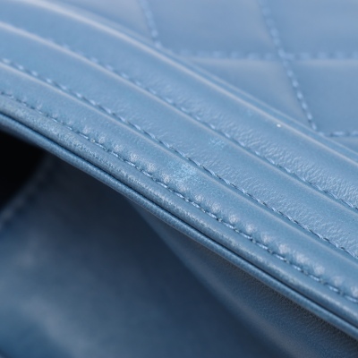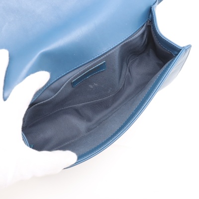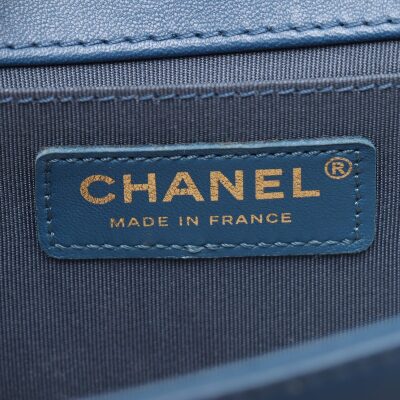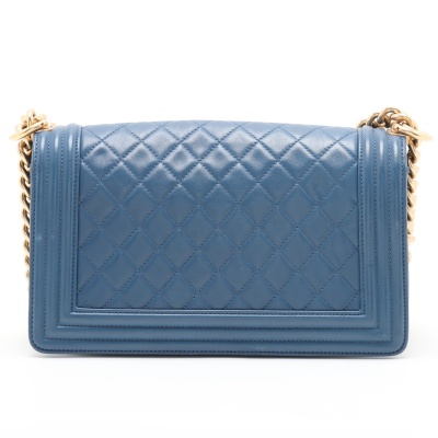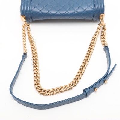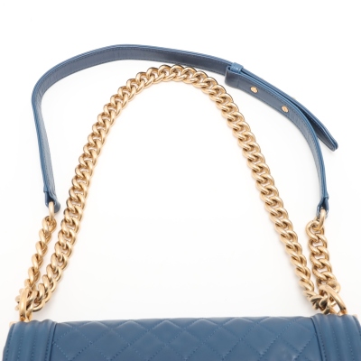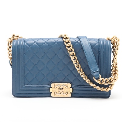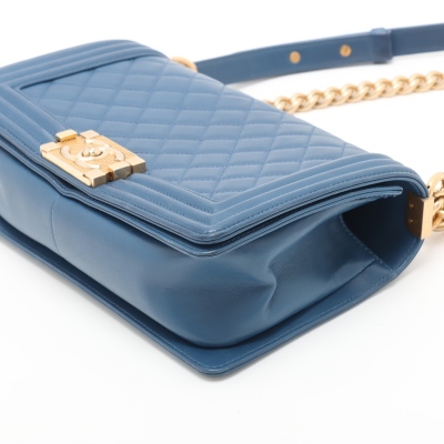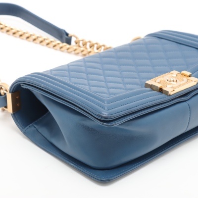 Chanel medium Boy flap bag in blue diamond quilted leather with linear-quilted border (#23XXXXXX, circa: 2016-17). Featuring aged gold-toned hardware, front flap with Chanel boy logo plate with micro-grid texture and a sliding chain-leather strap. The press lock closure opens to atonal textile interior with a patch pocket. Approximate dimensions: 25cm(W) x 15cm(H) x 8cm(D), with a 50cm adjustable strap drop. Accompanied by a Chanel authenticity card. With Entrupy Certificate of Authenticity.