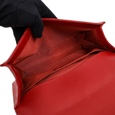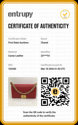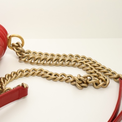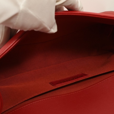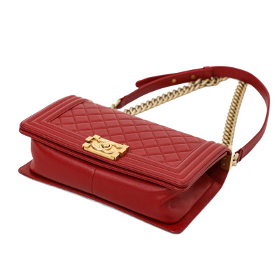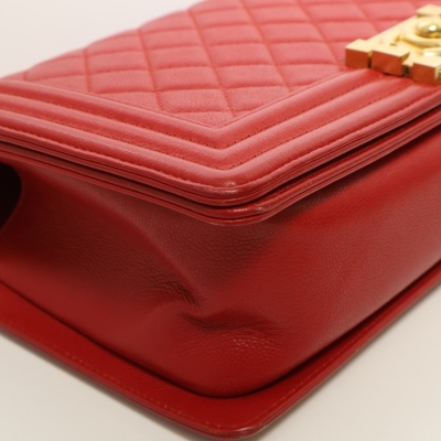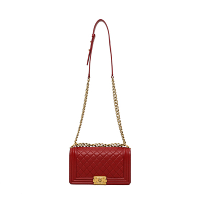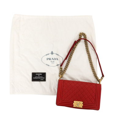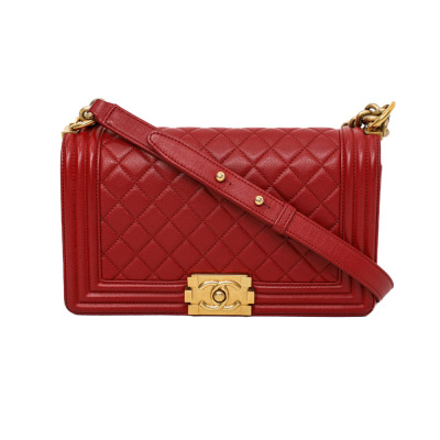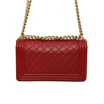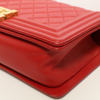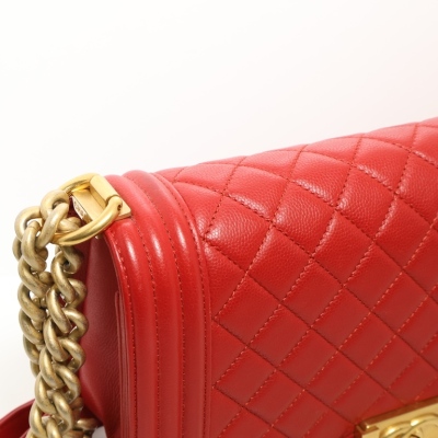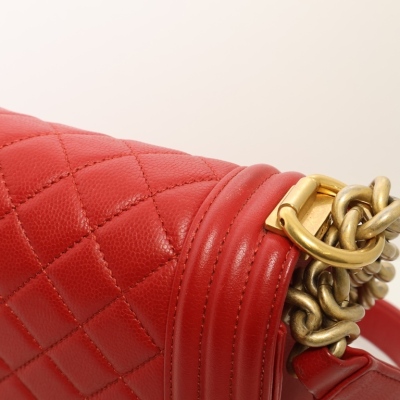 Chanel medium Boy flap bag in diamond-quilted red caviarskin with linear-quilted border & red stitches (#23xxxxxx). Featuring aged gold-toned hardware, front flap with Chanel boy logo press-lock closure. This opens to a red textile interior with a patch pocket. Approximate dimensions: 25cm(L) x 15cm(H) x 7cm(D), sliding chain link with leather pad shoulder strap drop 53cm. Accompanied by Chanel certificate card. With Entrupy Certificate of Authenticity. (Pre-owned)