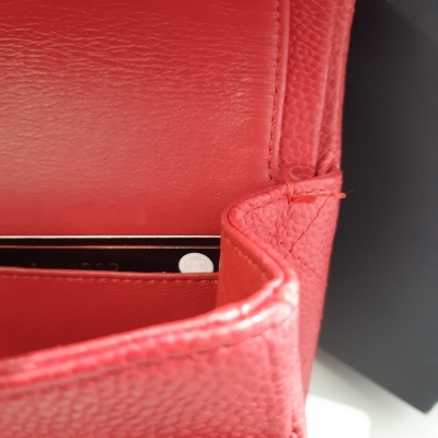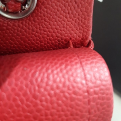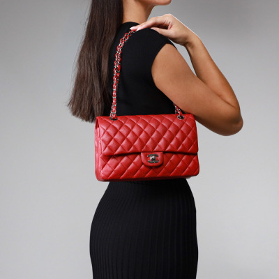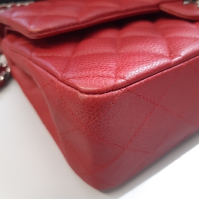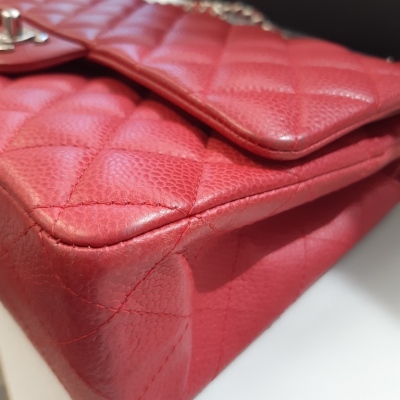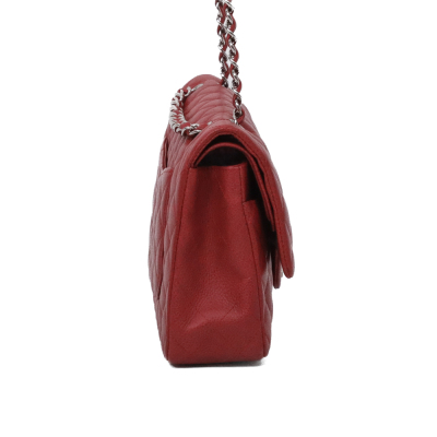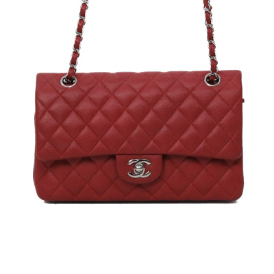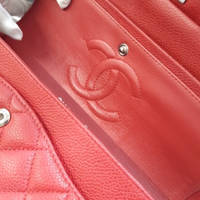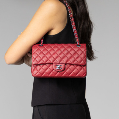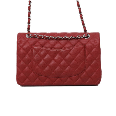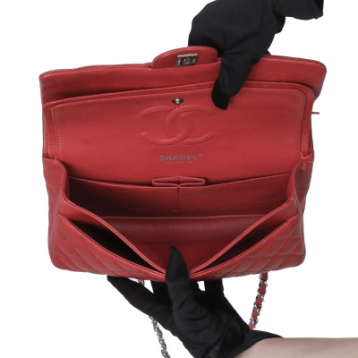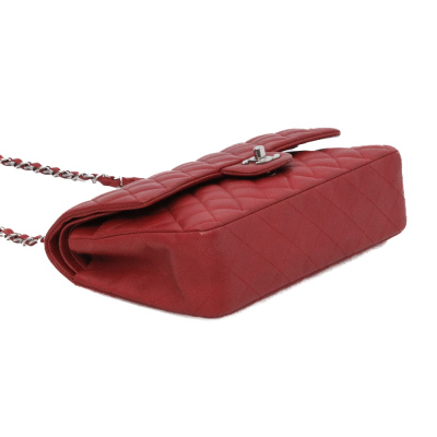 Chanel medium double flap in red diamond-quilted caviar skin (#14xxxxxx, Circa:2011). Featuring silver-toned hardware, exterior rear pocket, and double chain-leather threaded shoulder strap. The CC turn-lock closure & double flaps open to a red leather lining interior with a front compartment & patch pockets. Approx dimensions: 25cm(L) x 16cm(H) x 6cm(D), double strap drop 23cm. Accompanied by Chanel card, dust bag and box. With Entrupy Certificate of Authenticity. (Pre-owned)