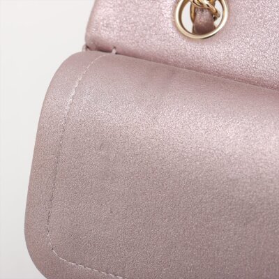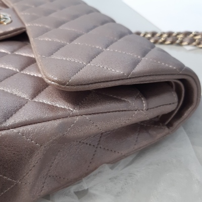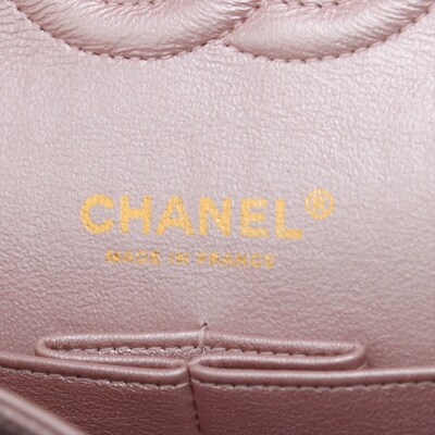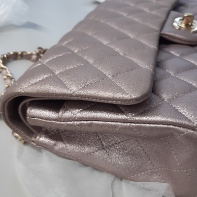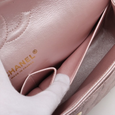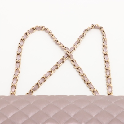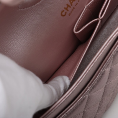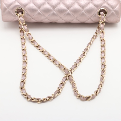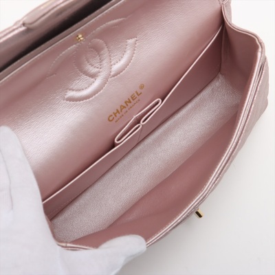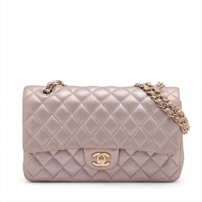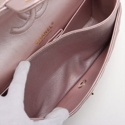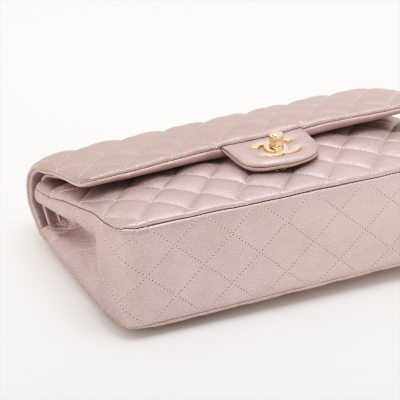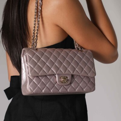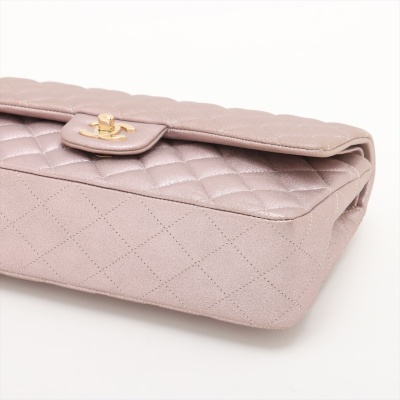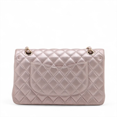 Chanel medium double flap bag in light purple diamond-quilted leather with glitter effective finish (#19xxxxxx). Featuring light gold-toned hardware, and exterior rear pocket. The CC turn-lock closure on flap opens to an inner flap covering frontal pocket and tonal leather interior with patch and zipper pockets. Approx dimensions: 25cm(L) x 15cm(H) x 6.5cm(D), double leather-chain shoulder strap drop 24cm. With Entrupy Certificate of Authenticity. (Pre-owned)