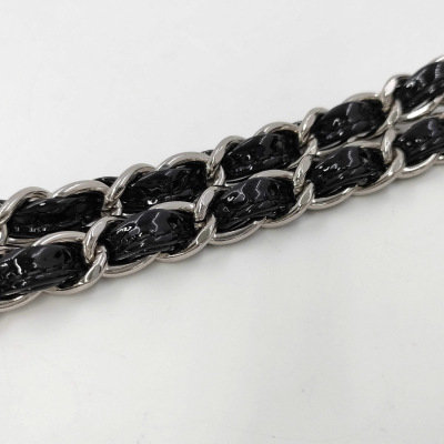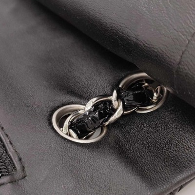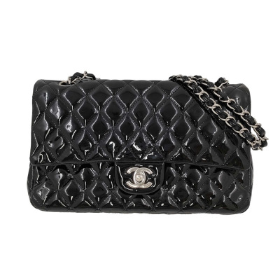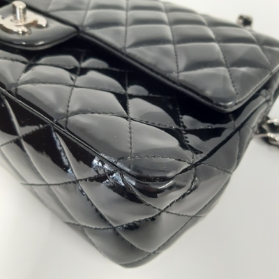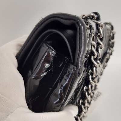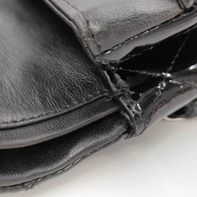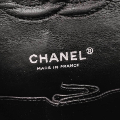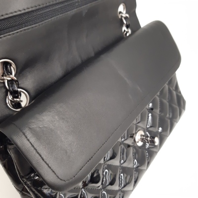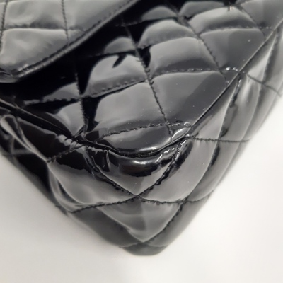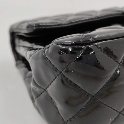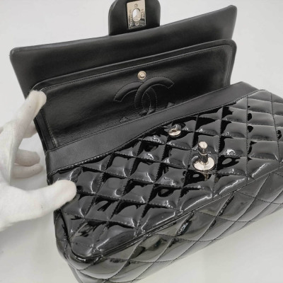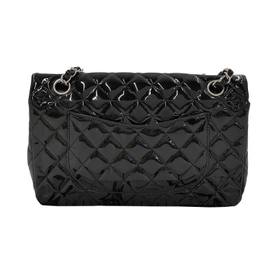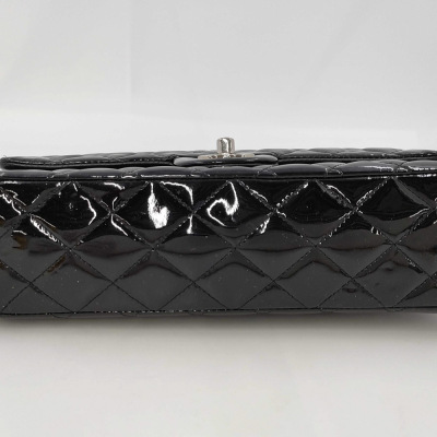 Chanel medium double flap bag in black patent leather (#14xxxxxx: 2011). Featuring silver-toned hardware, exterior rear pocket and sliding leather-chain woven shoulder straps. The classic CC turn-lock closure on flap opens to an inner flap and a black leather interior with zip and patch pockets. Approximate dimensions: 25cm(L) x 15cm(H) x 6.5cm(D), and 24cm dual shoulder strap drop. With Entrupy Certificate of Authenticity. (Pre-owned)