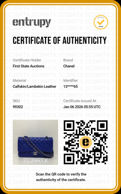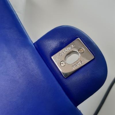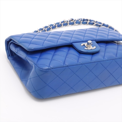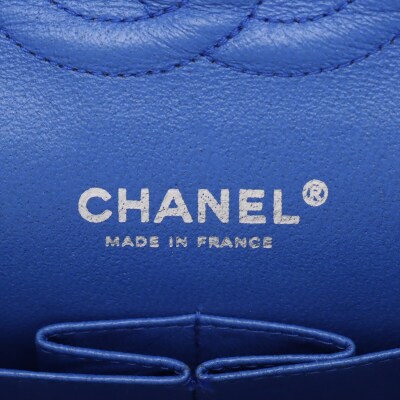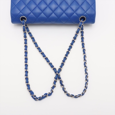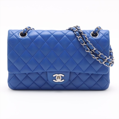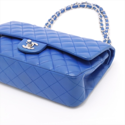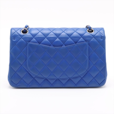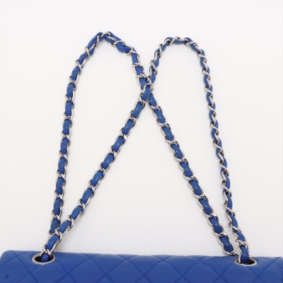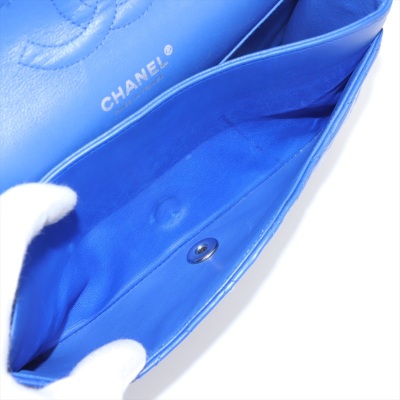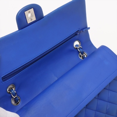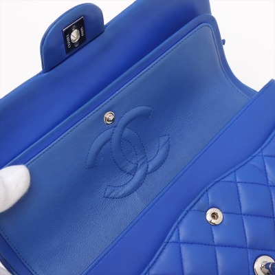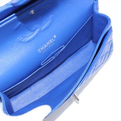 Chanel medium double flap bag in electric blue diamond-quilted lambskin leather (#13xxxxxx, circa: 2009-2010). Featuring silver-toned hardware, a leather-chain woven sliding shoulder strap and an exterior slip pocket at back. The classic CC turn-lock on frontal flap reveals to inner flap, an exterior slip pocket and a colour matching blue leather interior with two patch pockets. Approximate dimensions: 25.5cm(L) x 15.5cm(H) x 6cm(D), and 23cm doubled shoulder strap drop. With Entrupy Certificate of Authenticity. (Pre-owned)