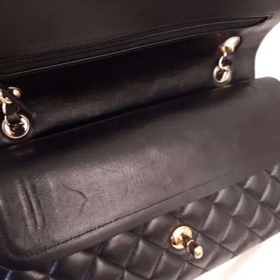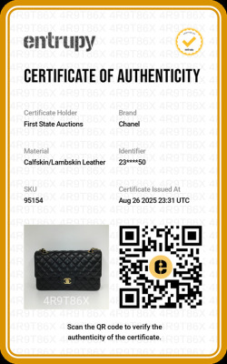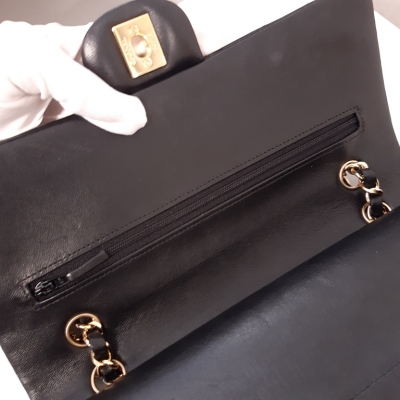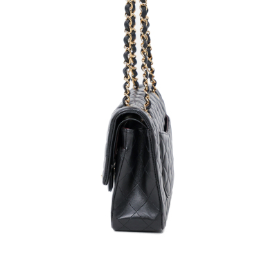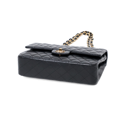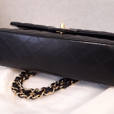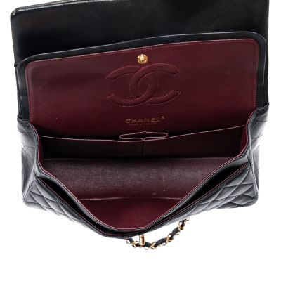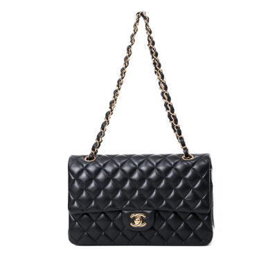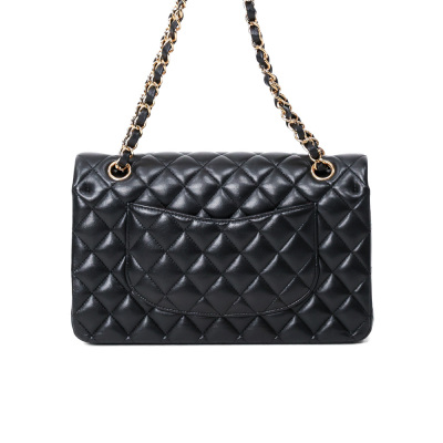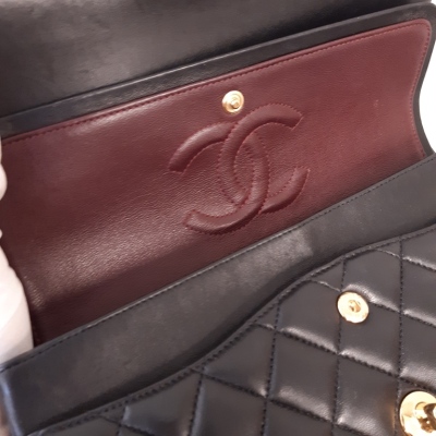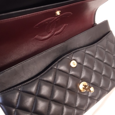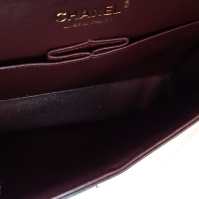 Diamond-quilted lambskin leather (#23xxxxxx). Featuring gold-toned hardware, exterior rear pocket, and double chain-leather threaded shoulder strap. The CC turn-lock closure and double flaps open to an exterior patch pocket and burgundy leather lining interior with patch pockets. Approx dimensions: 25cm(L) x 16cm(H) x 6cm(D), double strap drop 23cm. With Entrupy Certificate of Authenticity. (Pre-owned)