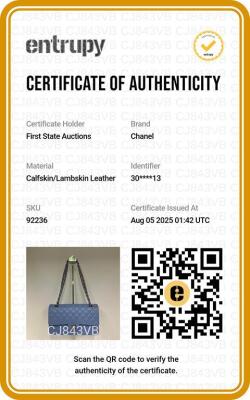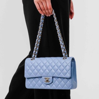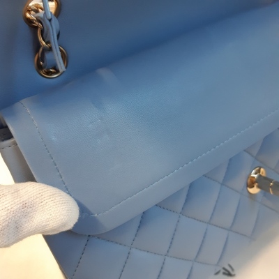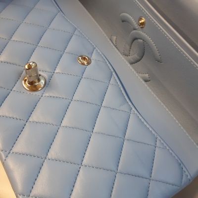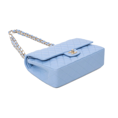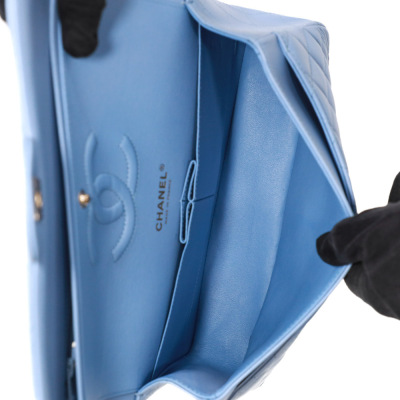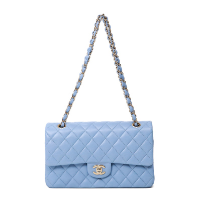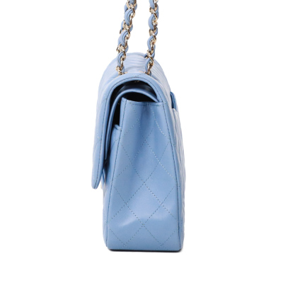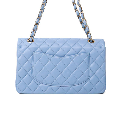 Chanel medium double flap bag in light blue diamond-quilted lambskin (#30xxxxxx). Featuring light gold-toned hardware, exterior rear pocket. The CC turn-lock closure opens to an inner flap and light blue leather interior with patch and zipper pockets. Approx dimensions: 25cm(L) x 15cm(H) x 6.5cm(D), double leather-chain shoulder strap drop 24cm. Accompanied by Chanel certificate card, stamped card, dustbag, box. With Entrupy Certificate of Authenticity. (Pre-owned)*