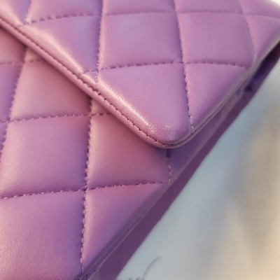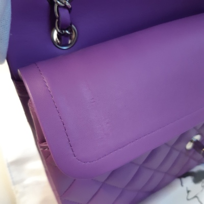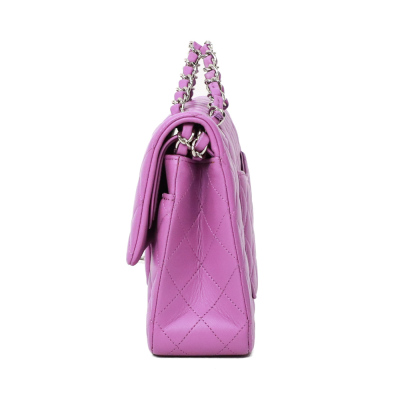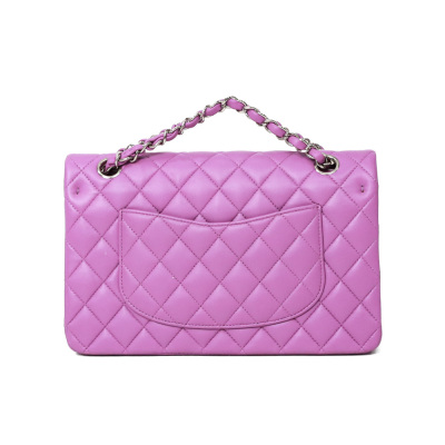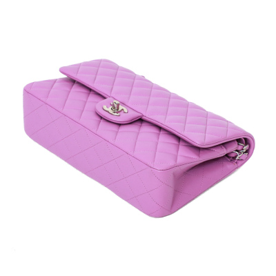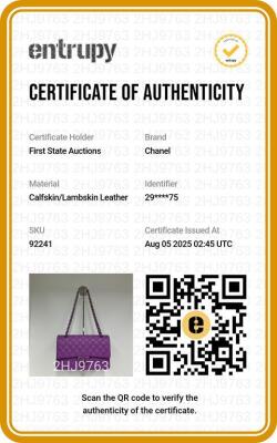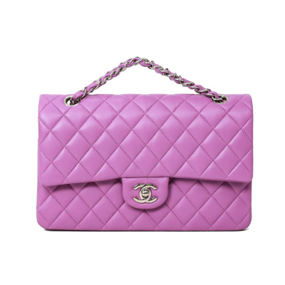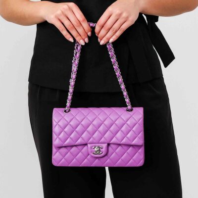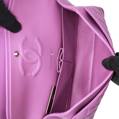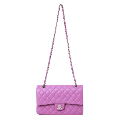 Chanel medium Double Flap bag in purple diamond-quilted lambskin (#29xxxxxx). Featuring silver-toned hardware, and exterior rear pocket. The CC turn-lock closure opens to an inner flap and purple leather interior with patch and zipper pockets. Approximate dimensions: 25cm(L) x 15cm(H) x 6.5cm(D), double leather-chain shoulder strap drop 24cm. Accompanied by Chanel certificate card, stamped card, dustbag, and box. With Entrupy Certificate of Authenticity. (Pre-owned)*