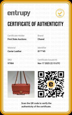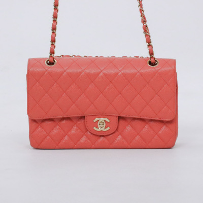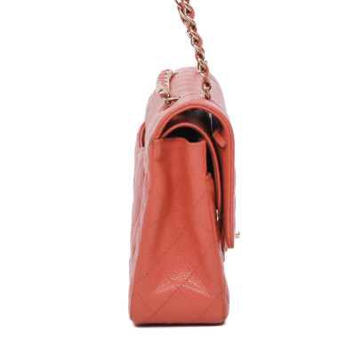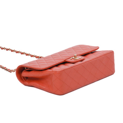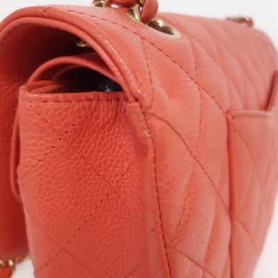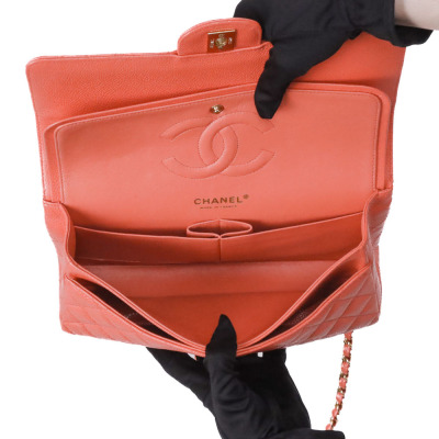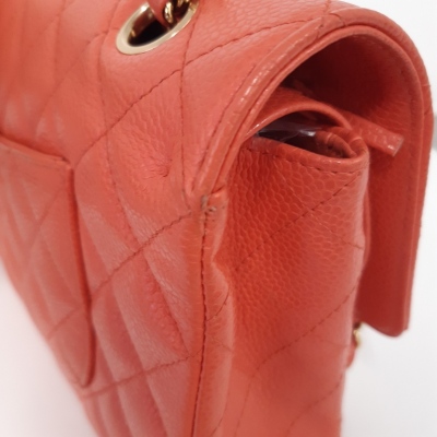 Chanel medium double flap bag in orange diamond-quilted caviar leather (#81xxxxx, circa: 2003-2004). Featuring gold-toned hardware, an exterior pocket at back and a sliding leather-chain woven shoulder strap. The classic CC turn-lock closure opens to an exterior slip pocket and a tonal leather interior with two patch pockets. Approximate dimensions: 25cm(L) x 15.5cm(H) x 6.5cm(D), and 45cm single shoulder strap drop. Accompanied by a Chanel card, dustbag and box. With Entrupy Certificate of Authenticity. (Pre-owned).