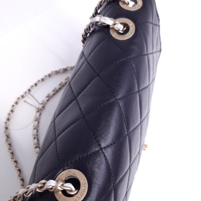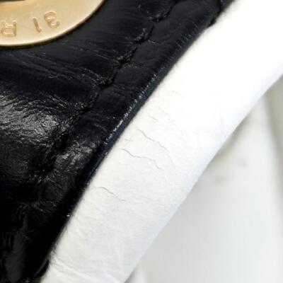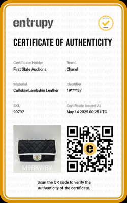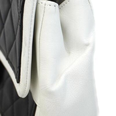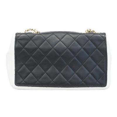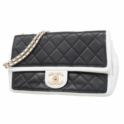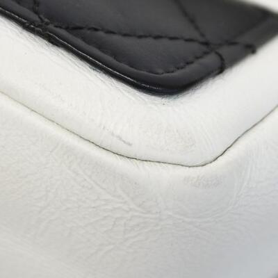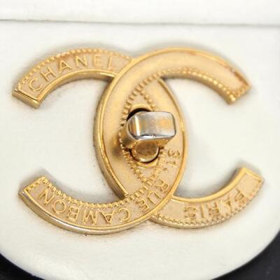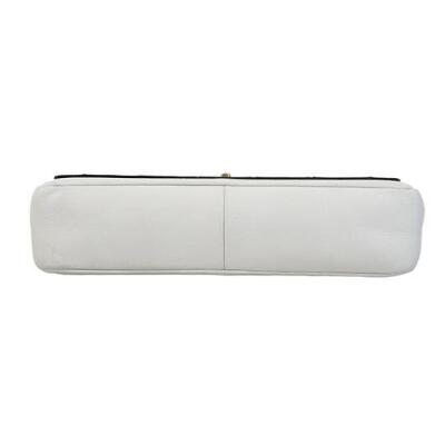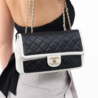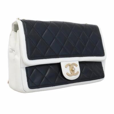 Chanel medium graphic flap bag (#19xxxxxx) in diamond-quilted white lambskin leather with black trim. Featuring light gold-toned hardware, leather-threaded gold chain shoulder strap, and flap with 'Chanel 31 Rue Cambon Paris' embossed CC turn-lock closure. Approximate dimensions: 26.5cm(L) x 15.5cm(H) x 5.5cm(D), double chain drop 24.5cm. With Entrupy Certificate of Authenticity. (Pre-owned)
