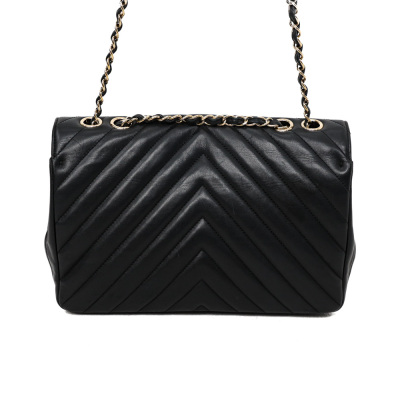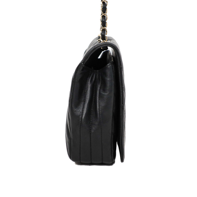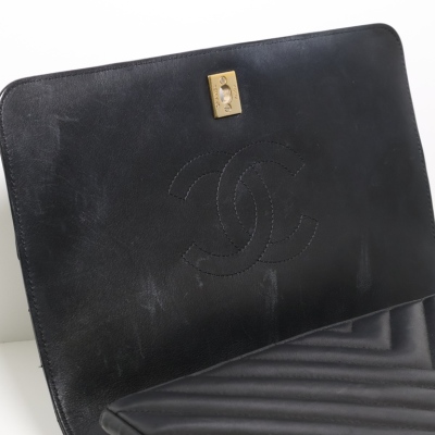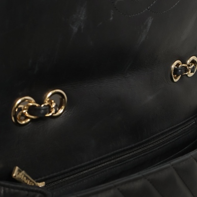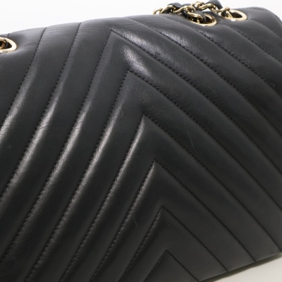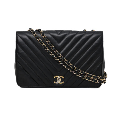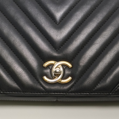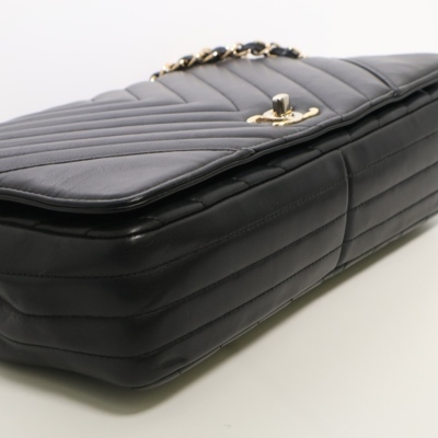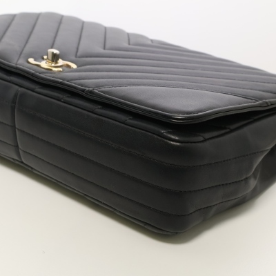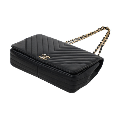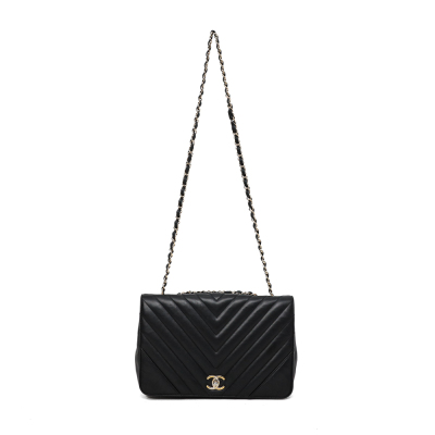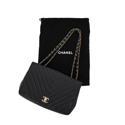 Chanel medium Statement flap bag in chevron quilted black lambskin (#24xxxxxx, circa:2017-18). Featuring shiny light gold-toned hardware and sliding leather-chain woven shoulder strap. The classic CC turn-lock on full flap opens to a tonal textile lining main compartment with zipped and patched pockets. Approximate dimensions: 27cm(L) x 17cm(H) x 7(D) and 25cm doubled shoulder strap drop. Accompanied by a Chanel dustbag. With Entrupy Certificate of Authenticity. (Pre-owned).