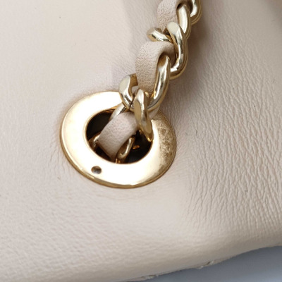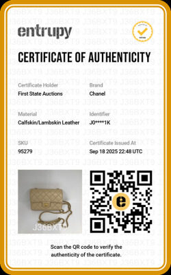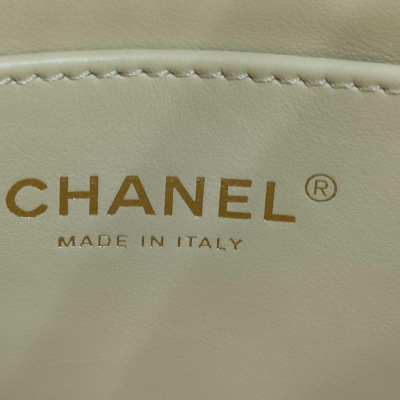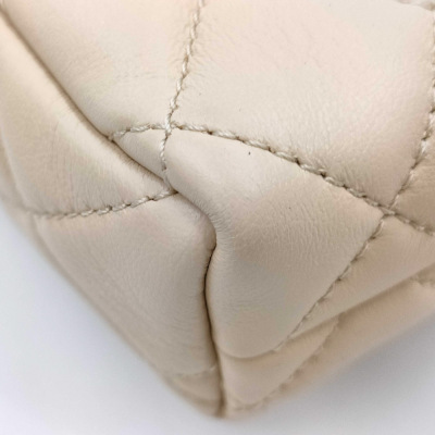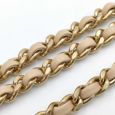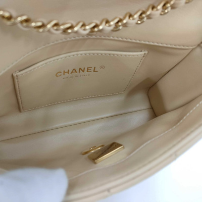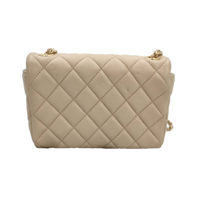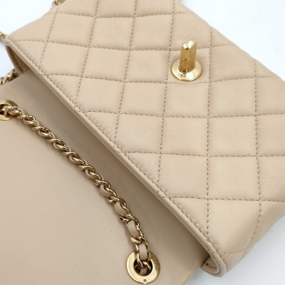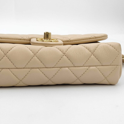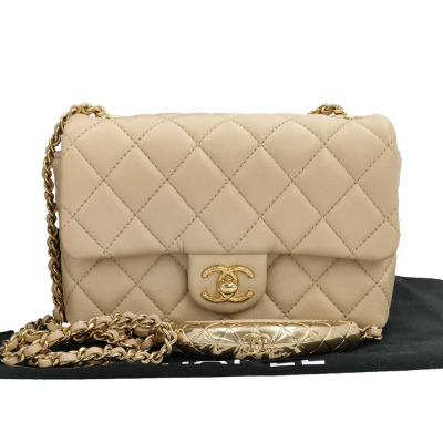 Chanel mini rectangle flap in diamond-quilted, beige lambskin (#J0xxxxxx). Featuring gold-toned hardware, and leather-chain shoulder strap with an adjustment metal & leather handle bar. The CC turn-lock closure on flap opens to a spacious tonal leather interior with patch pocket. Approx dimensions: 17.5cm(L) x 12cm(H) x 5cm(D), max strap drop 60cm. Accompanied by Chane booklet, dustbag and box. With Entrupy Certificate of Authenticity. (Pre-owned)