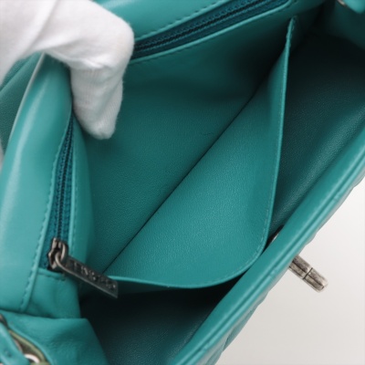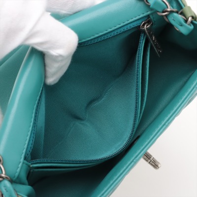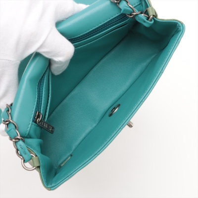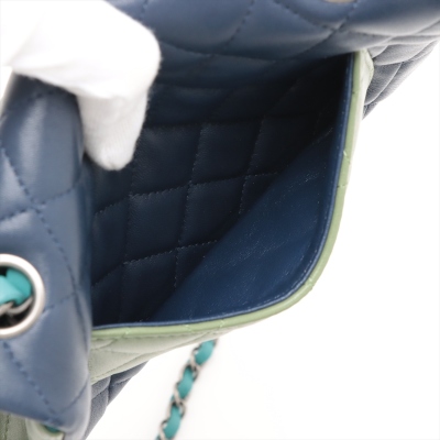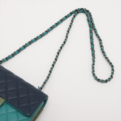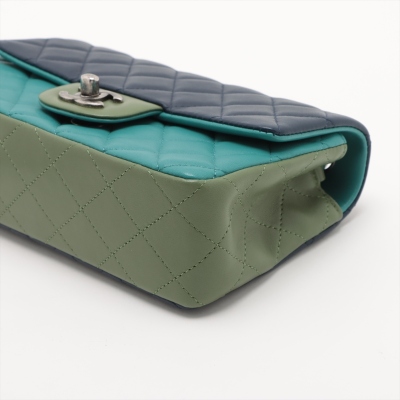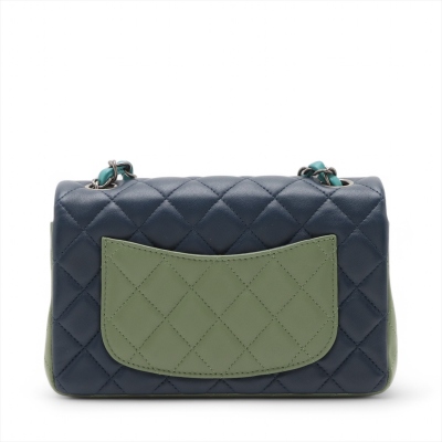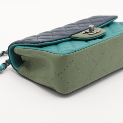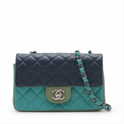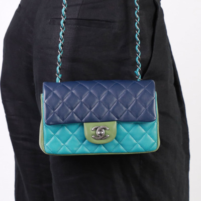 Chanel mini rectangular single flap bag in diamond-quilted lambskin leather (#21xxxxxx) in tri-colour. Featuring antique silver-toned hardware, a rear exterior patch pocket, and single chain-link shoulder strap. The CC turn lock closure on front flap opens to a blue leather interior with a patch and zip pockets. Approximate dimensions: 20cm(L) x 13cm(H) x 6cm(D), strap drop 57cm. Accompanied by Chanel Authentication Card. With Entrupy Certificate of Authenticity. (Pre-owned)