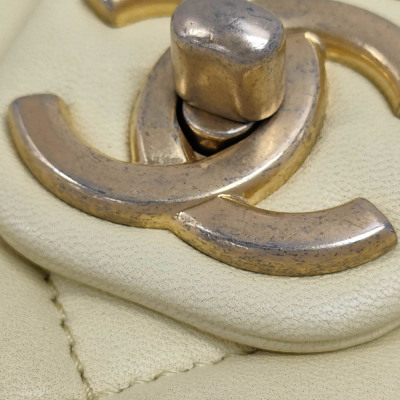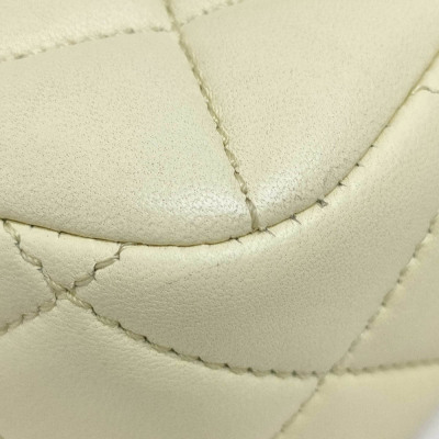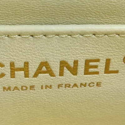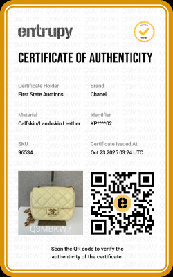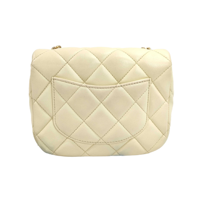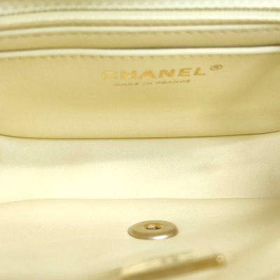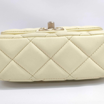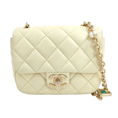 Chanel mini square flap bag in diamond-quilted, yellow lambskin leather (KPxxxxxx). Featuring aged gold-toned hardware, flat pocket at back and a chain shoulder strap embellished with pearl accent and enamel charms in pink and green. The CC turn-lock closure opens to a yellow leather interior with zip and patch pockets. Approx dimensions: 17cm(L) x 13cm(H) x 6cm(D), strap drop 56cm, adjustable. With Entrupy Certificate of Authenticity. (Pre-owned)