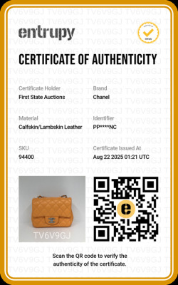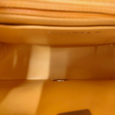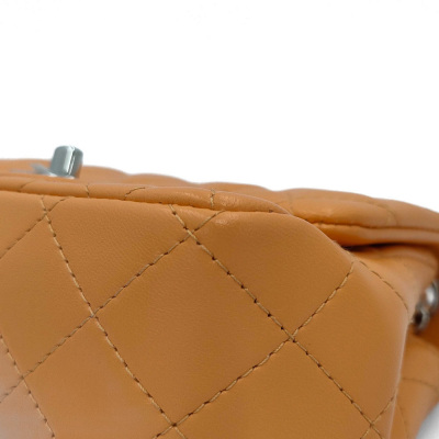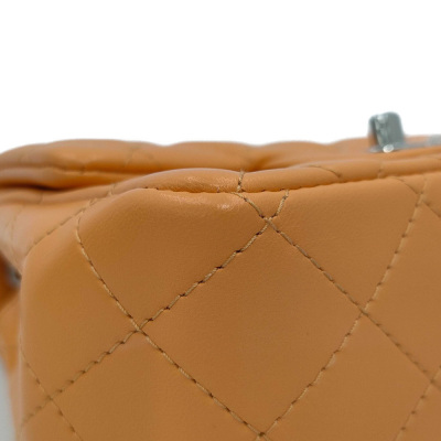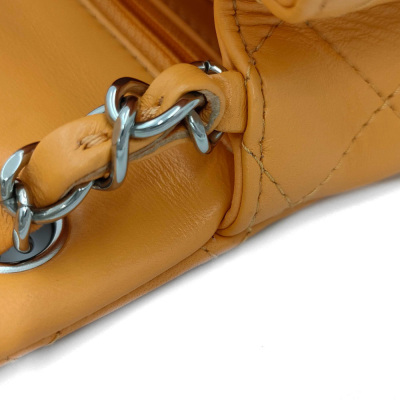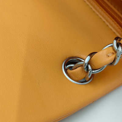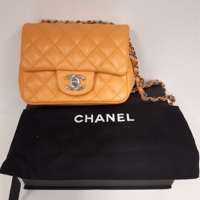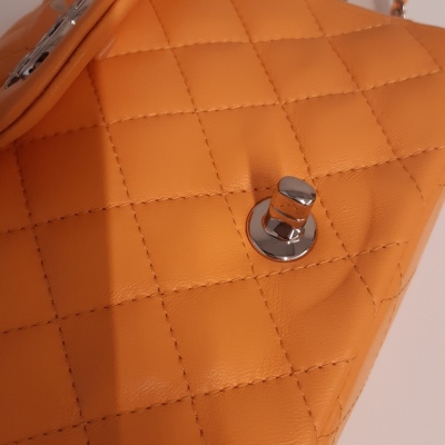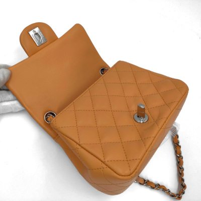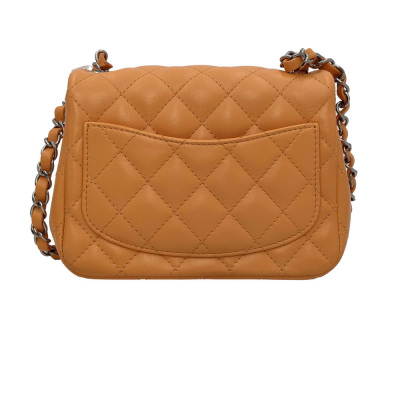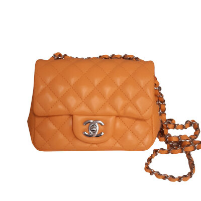 Chanel mini square flap bag in bright orange diamond-quilted lambskin (#PPxxxxxx). Featuring silver-toned hardware, exterior rear patch pocket, leather-chain shoulder strap, and CC turn-lock closure. This opens to a leather interior with a patch and zip pocket. Approximate dimensions: 17cm(L) x 13cm(H) x 7cm(D), strap drop 50cm. Accompanied by Chanel dustbag and box. With Entrupy Certificate of Authenticity. (Pre-owned)