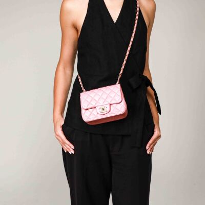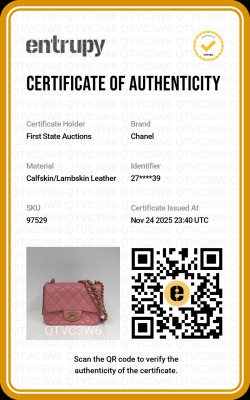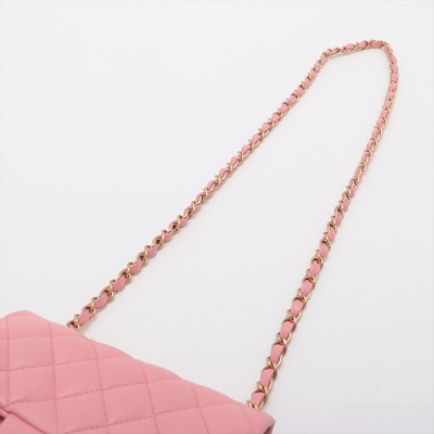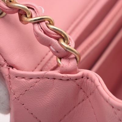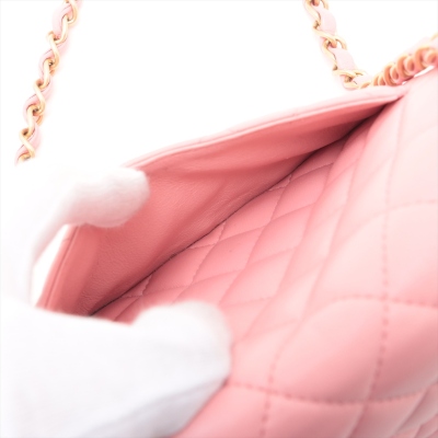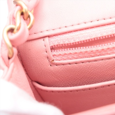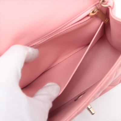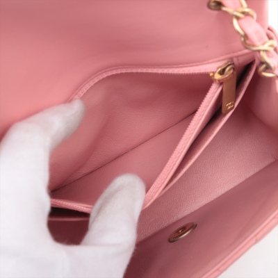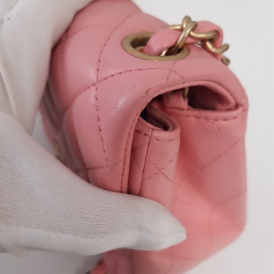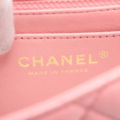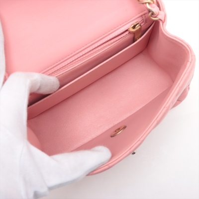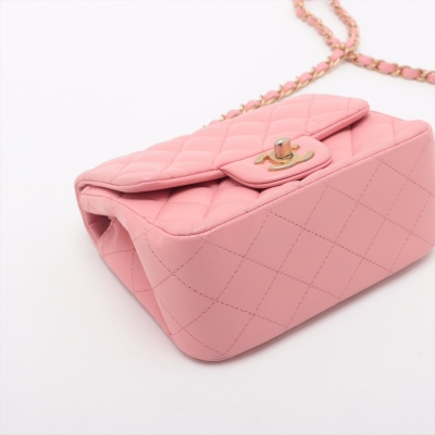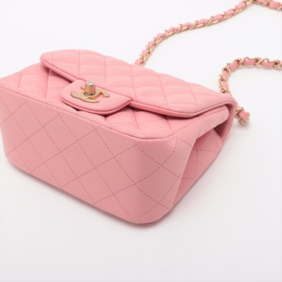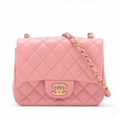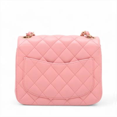 Chanel mini square flap bag in pink lambskin leather (27xxxxxx). Featuring aged gold-tone hardware, exterior pocket at back and classic chain leather strap. The CC turn-lock closure on flap opens to a pink leather interior with a patch pocket and zip pocket. Approximate dimensions: 16.5cm(W) x 13cm(H) x 7cm(D), 52cm chain drop. Accompanied by Chanel certificate card. With Entrupy Certificate of Authenticity. (Pre-owned)