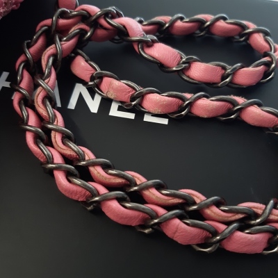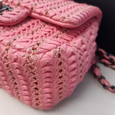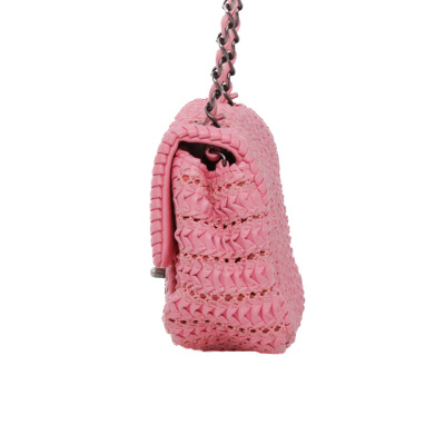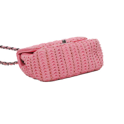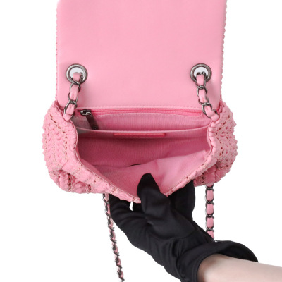 Chanel mini square flap bag in pink quilted lambskin leather (#21xxxxxx, Circa: 2015-2016). Featuring antique metal-toned hardware and a leather-chain woven shoulder strap. The classic CC turn-lock closure opens to a pink textile-lined interior with a patch pocket and a zip pocket. Approximate dimensions: 17cm(L) x 14.5cm(H) x 7.5(D), and 63.5cm shoulder strap drop. Accompanied by a Chanel certificate card, dustbag and box. With Entrupy Certificate of Authenticity. (Pre-owned)