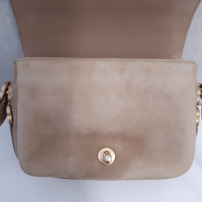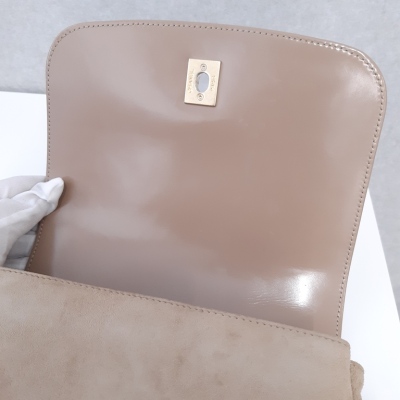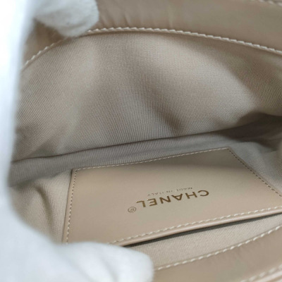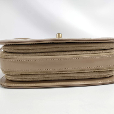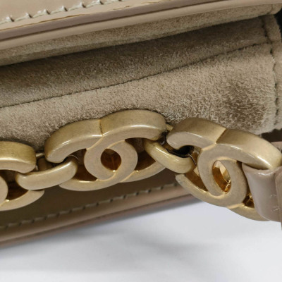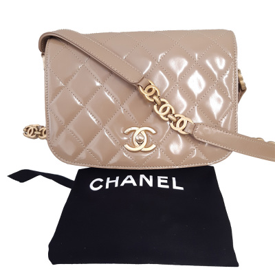 Chanel My Sweet flap bag in beige diamond-quilted shiny calfskin & suede(#KGxxxxxx). Featuring gold-tone hardware, an exterior slip pocket at back & accordion sides with CC chain links. The turn-lock closure opens to a beige fabric lining interior with 3 compartments & a card slot. Approx. dimensions: 20cm(L) x 15cm(H) x 12cm(D), leather strap with CC logo link detail drop: 53cm. Accompanied by Chanel dustbag. With Entrupy Certificate of Authenticity. (Pre-owned).