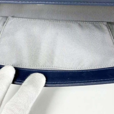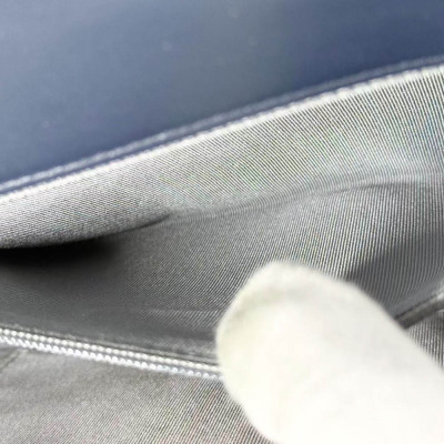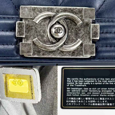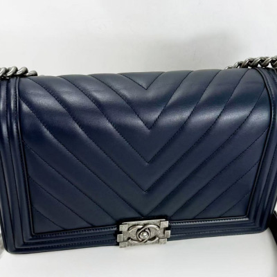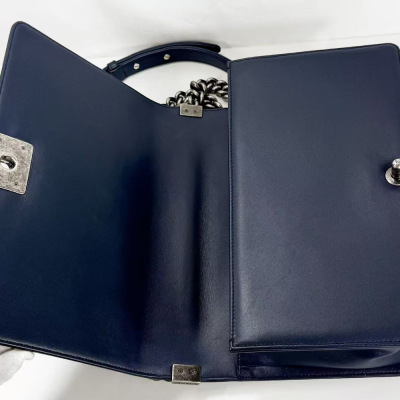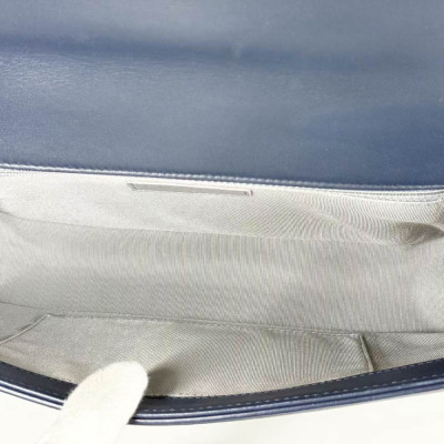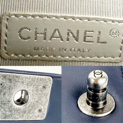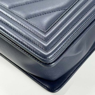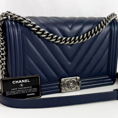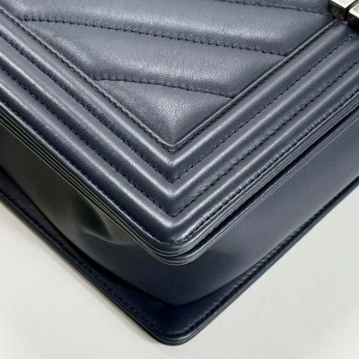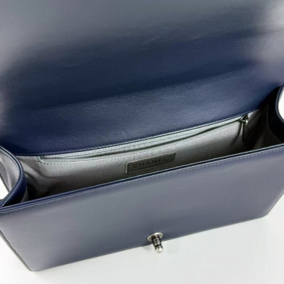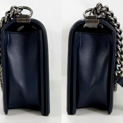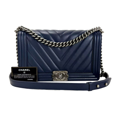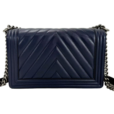 Chanel New Medium Boy flap bag in chevron-quilted navy blue lambskin leather with a linear-quilted border (#20xxxxxx, circa: 2014). Featuring aged silver-toned hardware and front flap with Chanel boy logo press-lock closure. This opens to a grey textile interior with a zip pocket. Approximate dimensions: 27.5cm(L) x 18cm(H) x 7.5cm(D), chain link with an adjustable leather shoulder pad strap drop 53cm. Accompanied with a Chanel authenticity card. With Entrupy Certificate of Authenticity. (Pre-owned)