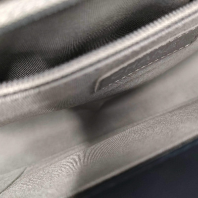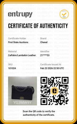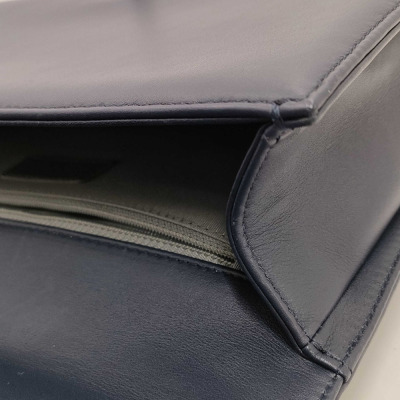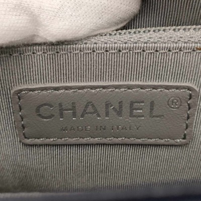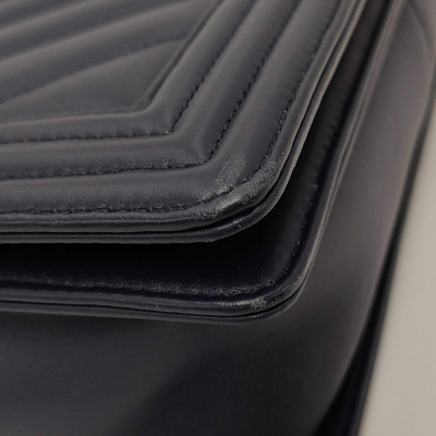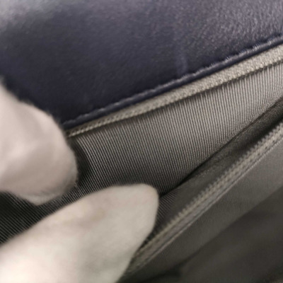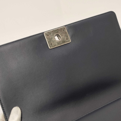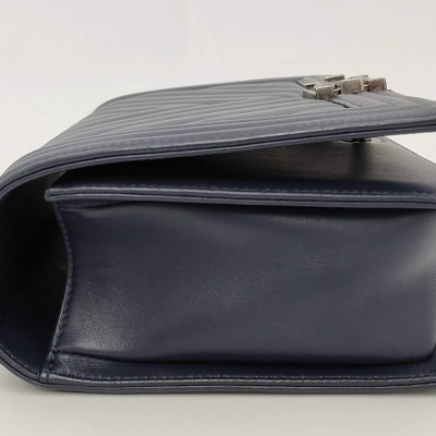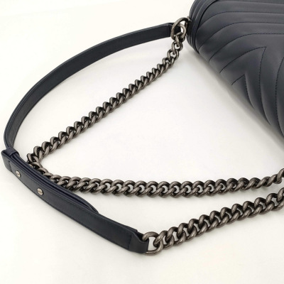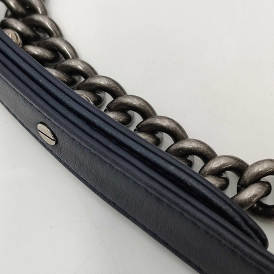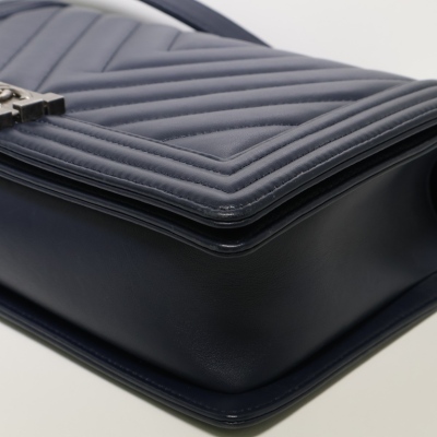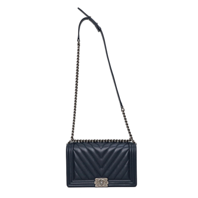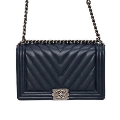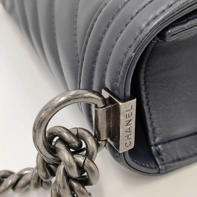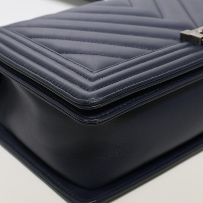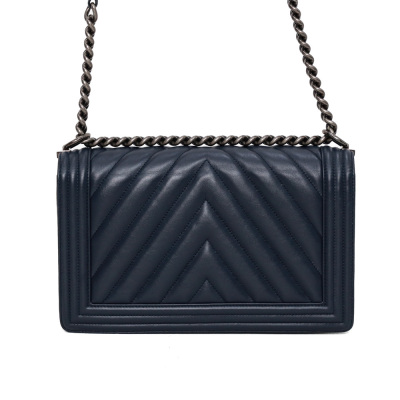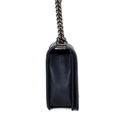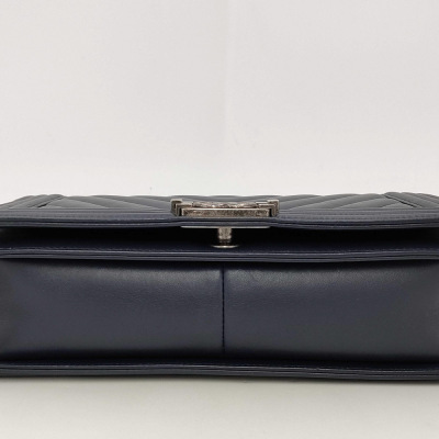 Chanel New Medium Boy flap bag in navy blue chevron quilted leather with linear-quilted border (#21XXXXXX, circa: 2015-2016). Featuring aged gunmetal-toned hardware, front flap with Chanel boy logo press-lock closure and a sliding chain-leather strap. This opens to a light grey textile interior with a patch and zippered pocket. Approximate dimensions: 28cm(W) x 17cm(H) x 8cm(D), with a 50cm adjustable strap drop. With Entrupy Certificate of Authenticity.