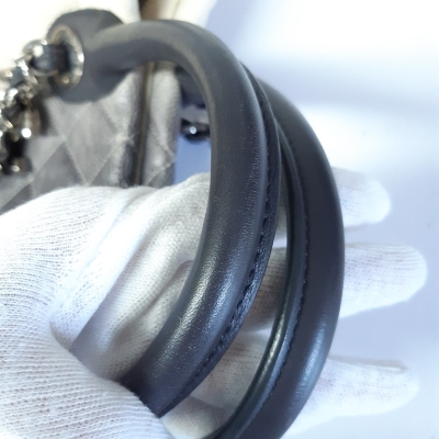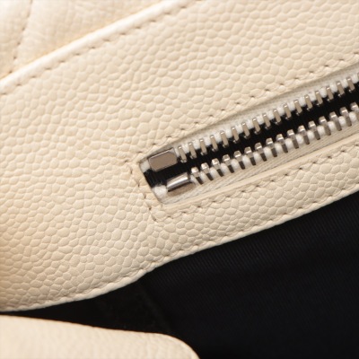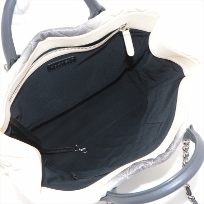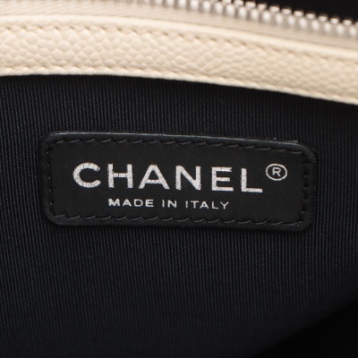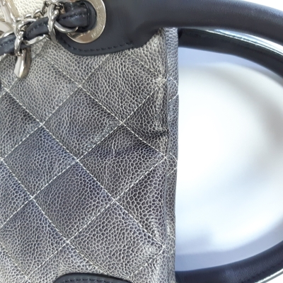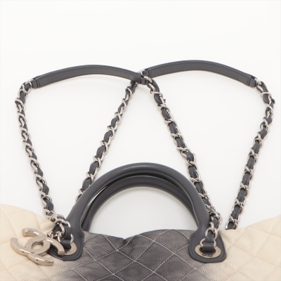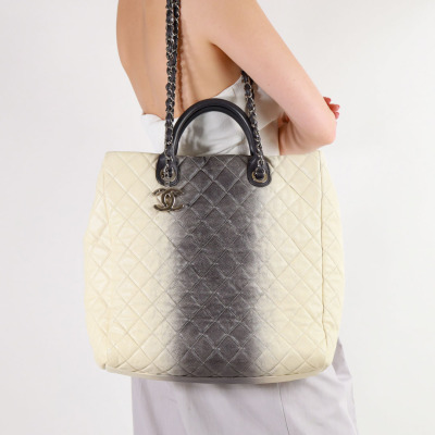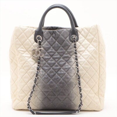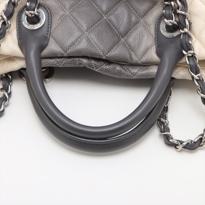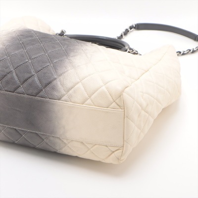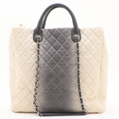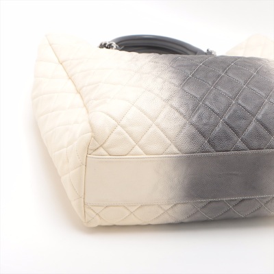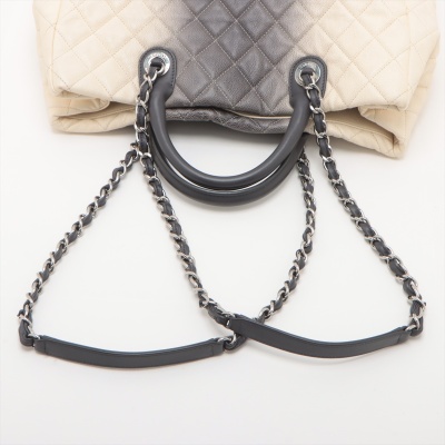 Chanel Ombre Shiva shopping tote in ivory & grey Caviar skin with diamond pattern stitching (17xxxxxx). Featuring silver-tone hardware, gray leather handles, chain-leather threaded shoulder straps, CC logo pendant at front. The open top opens to a black fabric interior with zipper and patch pockets. Approx dimensions: 35cm(W) x 34cm(H) x 13cm(D), 8cm handle drop & 34cm shoulder drop. Accompanied by Chanel dustbag. With LegitApp Certificate of Authenticity. (Pre-owned)