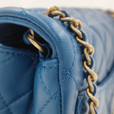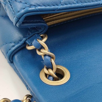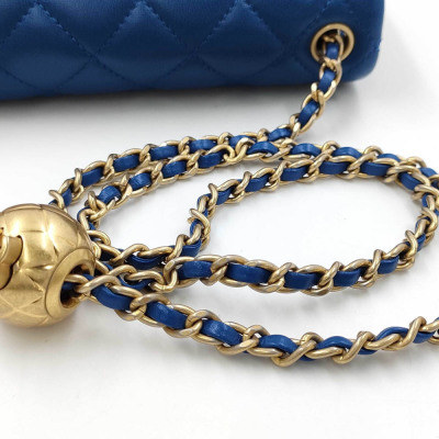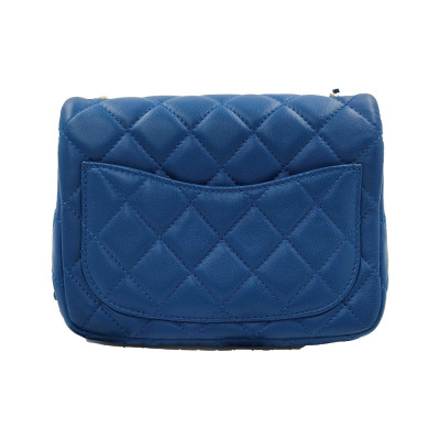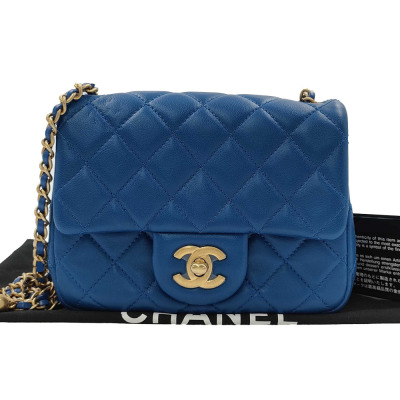 Chanel Pearl Crush mini square flap bag in diamond-quilted, blue lambskin (#29xxxxxx). Featuring aged gold-toned hardware, flat pocket at back, and leather-chain shoulder strap with an adjustment golden ball. The CC turn-lock closure on flap opens to a gold leather interior with zip and patch pockets. Approx dimensions: 17cm(L) x 12cm(H) x 6.5cm(D), strap drop 56cm, adjustable. Accompanied by Chanel card and dustbag. With Entrupy Certificate of Authenticity. (Pre-owned)