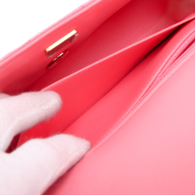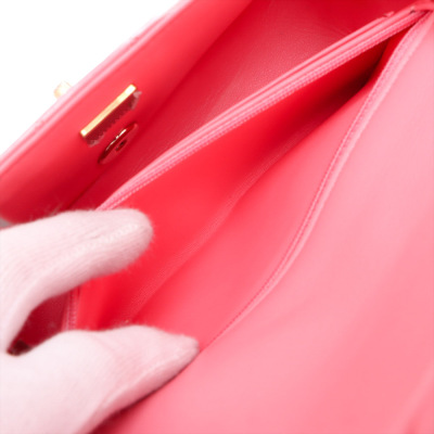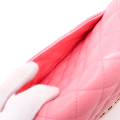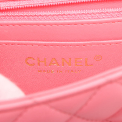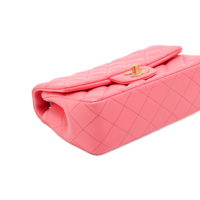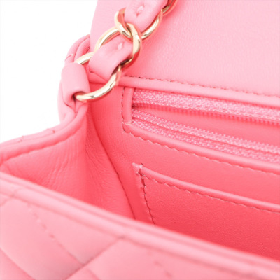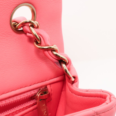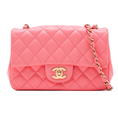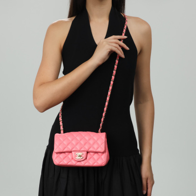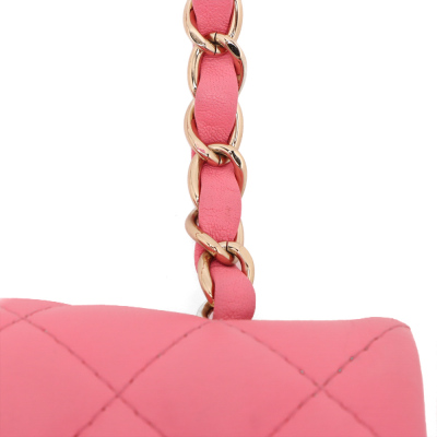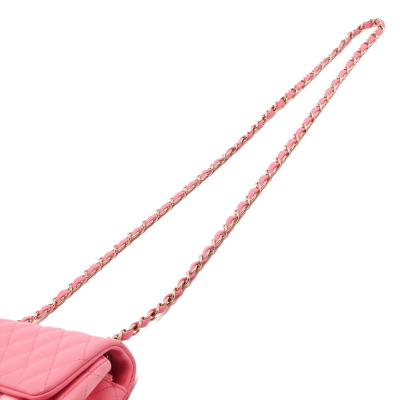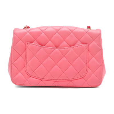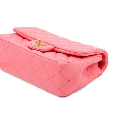 Chanel rectangle mini flap in diamond-quilted, candy pink lambskin (#T6XXXXXX). Featuring shiny gold-toned hardware, a flat pocket at back, and leather-chain shoulder strap. The CC turn-lock closure on flap opens to matching pink leather interior with zip and patch pockets. Approximate dimensions: 20cm(W) x 12.5cm(H) x 6.5cm(D), with a 56cm strap drop. With Entrupy Certificate of Authenticity.