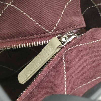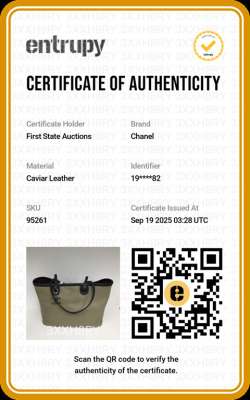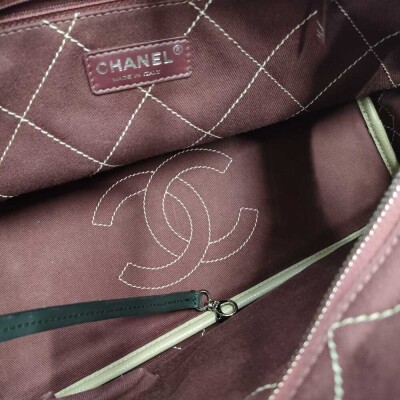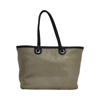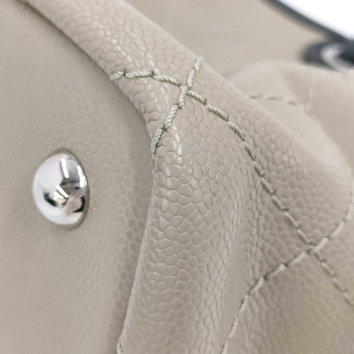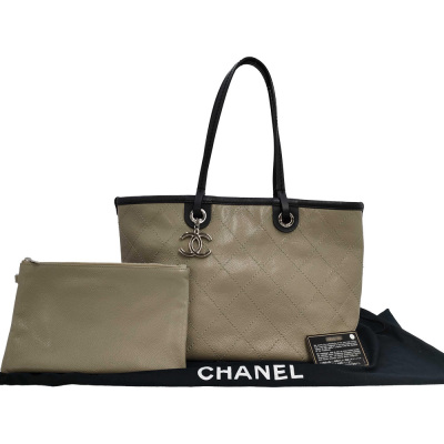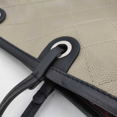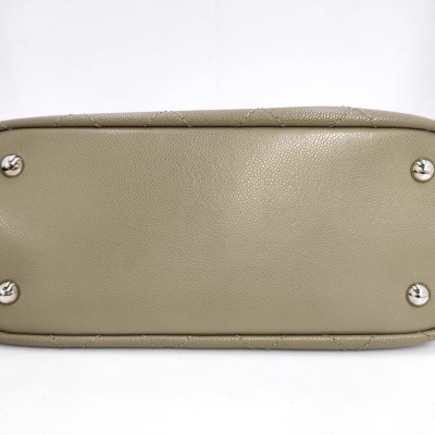 Chanel Shopping Fever tote in greyish-green diamond stitched Caviarskin with black leather trim (19xxxxxx). Featuring silver-toned hardware, dual leather strap handles, a hanging CC logo charm. The top opens to a burgundy fabric interior with white diamond quilted stitching with zipper & patch pockets. Approx dimensions: 32cm(W) x 25cm(H) x 15cm(D), 23cm handle drop. Accompanied by an internal pouch, cert card, dustbag. With Entrupy Certificate of Authenticity. (Pre-owned)