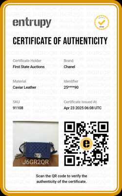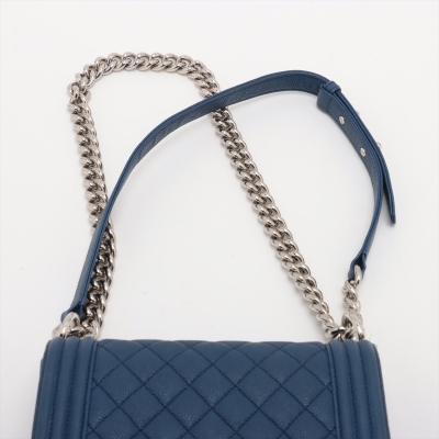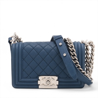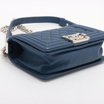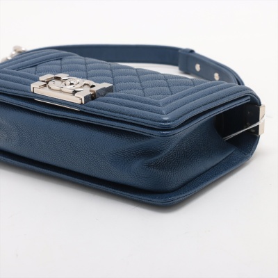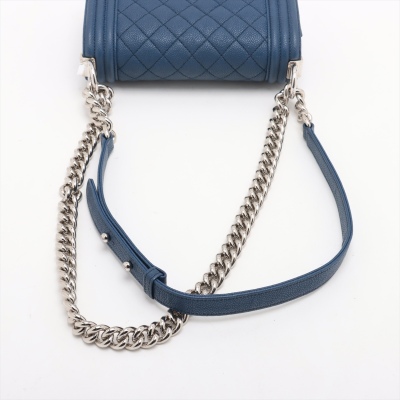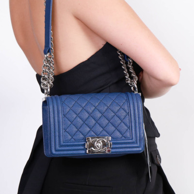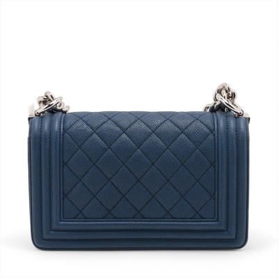 Chanel small Boy flap bag in diamond-quilted dark blue caviar leather with linear quilted border (25xxxxxx). Featuring shiny silver-toned hardware, and front flap with Chanel Boy logo press-lock closure. This opens to a blue textile interior with a patch pocket. Approximate dimensions: 20cm(L) x 12cm(H) x 6cm(D), single leather-chain strap drop 55cm. Accompanied by Chanel authentication card. With Entrupy Certificate of Authenticity. (Pre-owned)